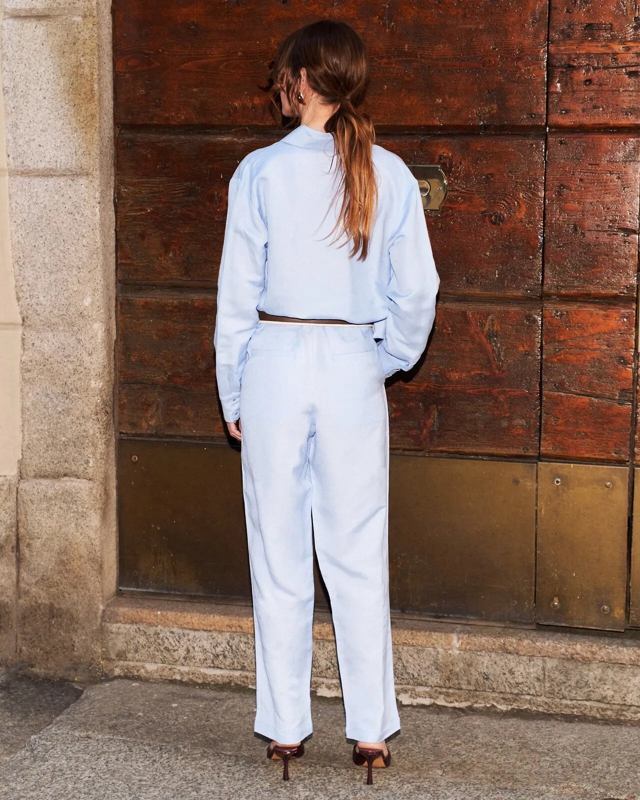 Conjunto de Linho Azul Claro Camisa e Calça,Anne Fernandes. Camisa alfaiataria, possui gola, mangas longas, punho ajustado com fechamento em botão, fechamento frontal da camisa em botões. Calça modelo cenoura, possui cós com passante, pregas na parte frontal e traseira, possui bolso tipo faca lateral e bolsos na parte traseira,fechamento em zíper e colchete na parte frontal.