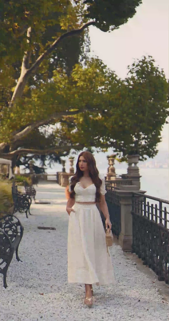 Delicadeza artesanal em um visual leve e atemporal. O top estruturado com decote coração possui mangas bufantes, aplicação floral em guipir e acabamento com mini pompons que reforçam o toque romântico. A saia midi rodada completa o look com a elegância das cores naturais. Possui zíper de metal nas costas.