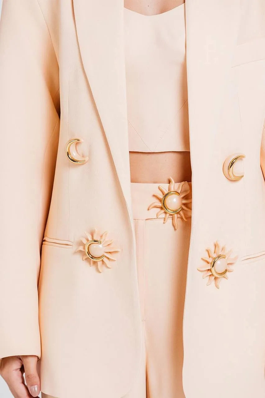 Confeccionado em nosso tecido mais nobre da alfaiataria, o crepe de acetato com viscose, dispõe-se de toque suave e caimento reto impecável. A peça apresenta modelagem oversized estruturada e comprimento levemente alongado, proporcionando visual elegante e imponente ao mesmo tempo. O Blazer Bela possui detalhes de nossos poderosos botões personalizados Lua e Sol, que arrematam o look com um toque de surrealismo e primor incomparável.