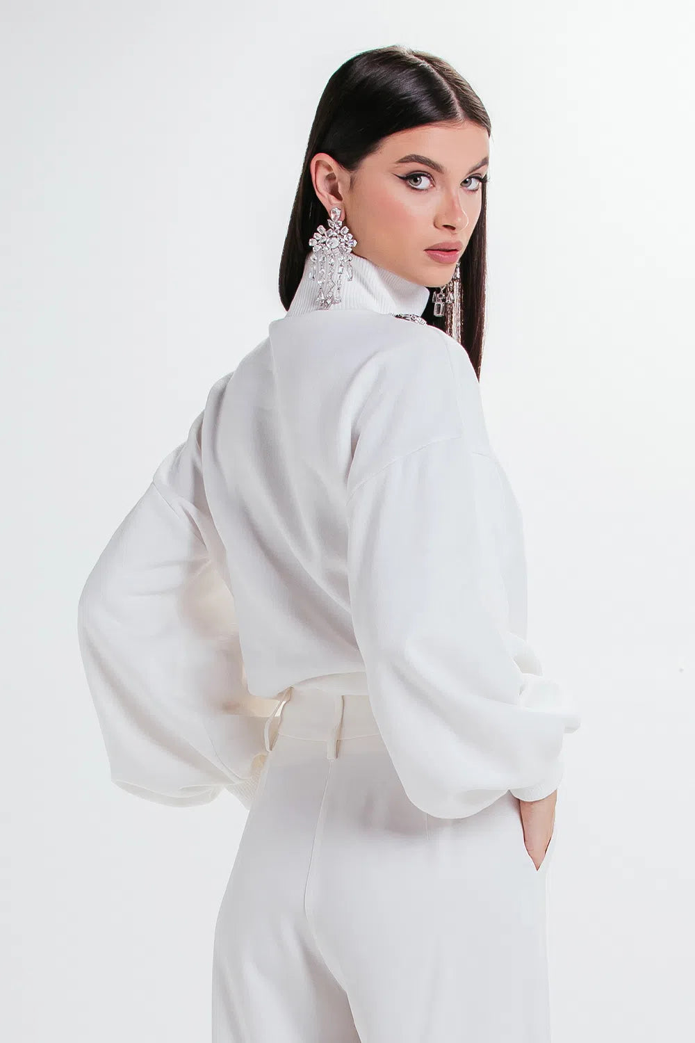 Nossa blusa moletom é uma verdadeira preciosidade! Feita em algodão, possui modelagem com mangas bufantes e gola alta, numa pegada super feminina, além de bordados feitos à mão em forma de colar nos ombros, remetendo a joias e pedras preciosas. Uma maneira de deixar os looks de inverno cheios de sofisticação!
