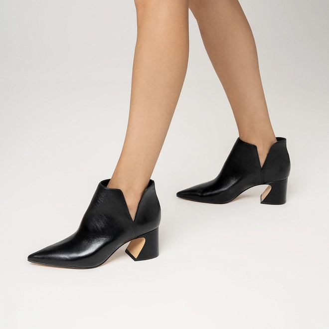 Bota de couro com bico fino alongado e salto wave levemente curvado que garante um visual sofisticado e marcante. O recorte lateral no modelo adiciona um toque sexy e moderno.