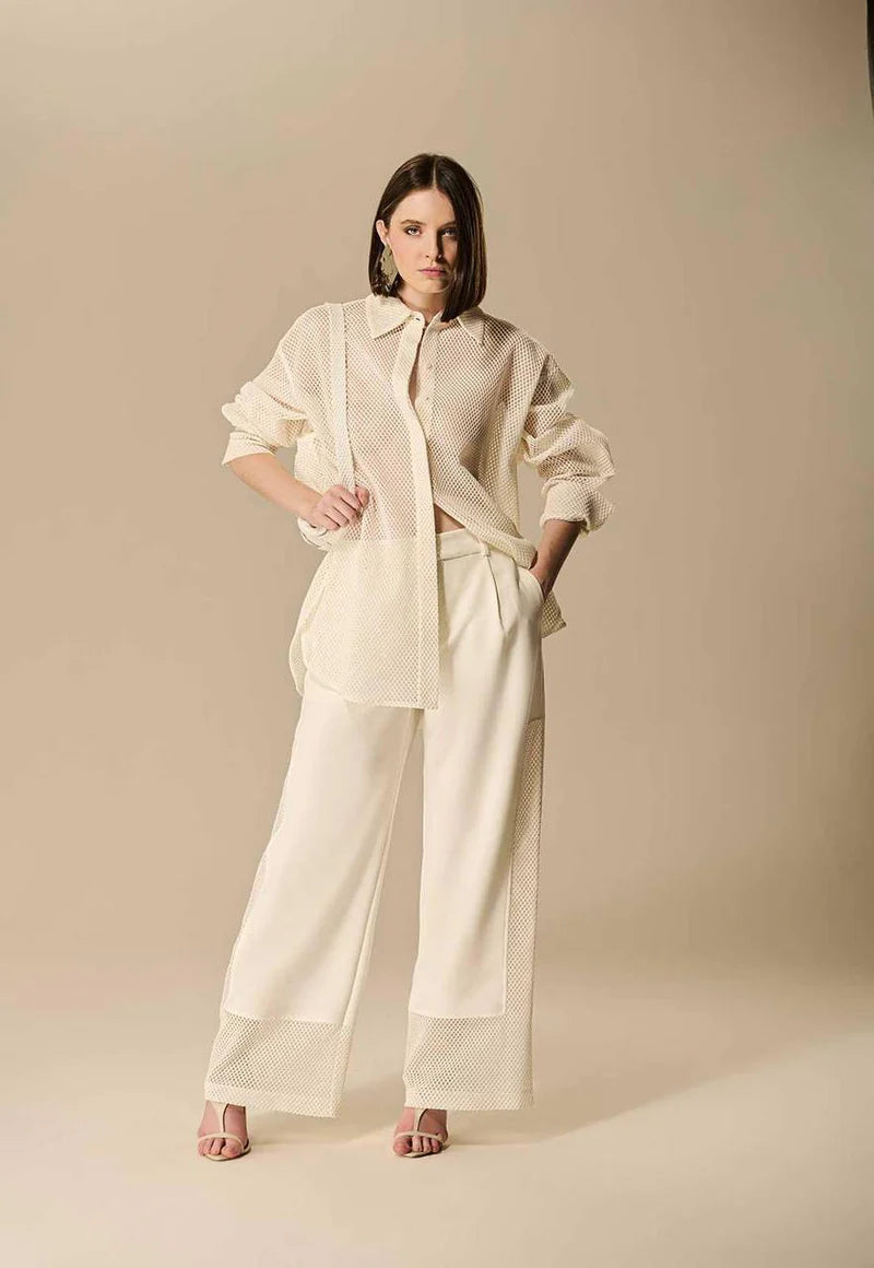Com um design sofisticado e toque contemporâneo, a Calça Alfaiataria Detalhe Tela é uma aposta certeira para 2026. Em tom off-white, a peça se destaca pelas aplicações em tela na barra, que adicionam textura, leveza e um charme inesperado ao visual. A modelagem reta alonga a silhueta, enquanto os bolsos utilitários nas costas reforçam a estética moderna com um toque funcional. Ideal para quem busca sofisticação com personalidade, vai bem tanto com sandálias quanto com mules elegantes.