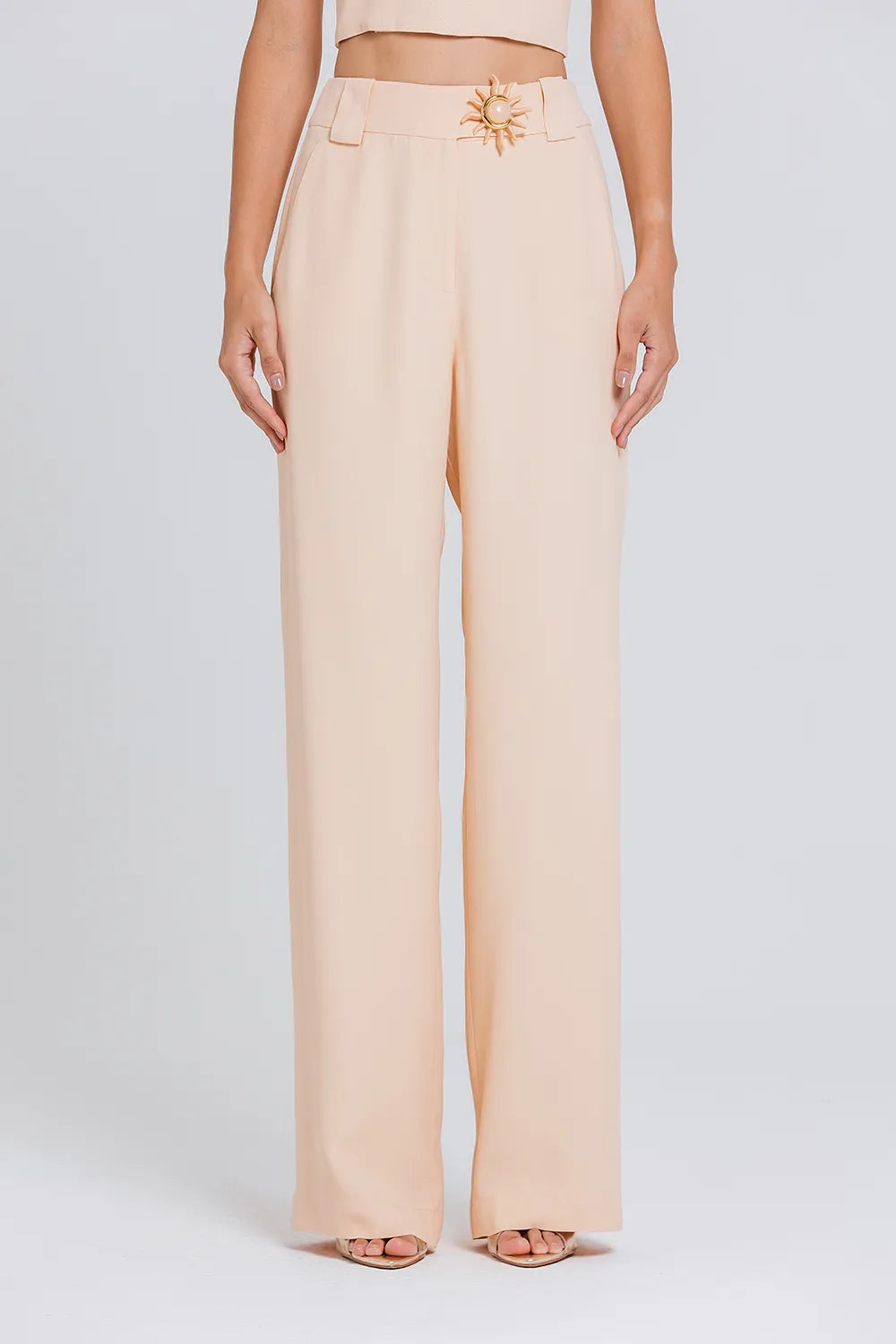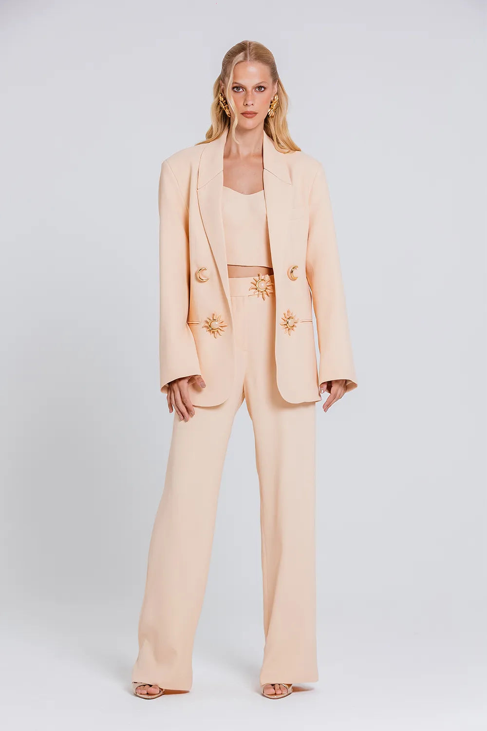 Combine a Calça Amara com o Top Elana para um visual elegante e diurno ou acrescente o Blazer Bela para ocasiões especiais!