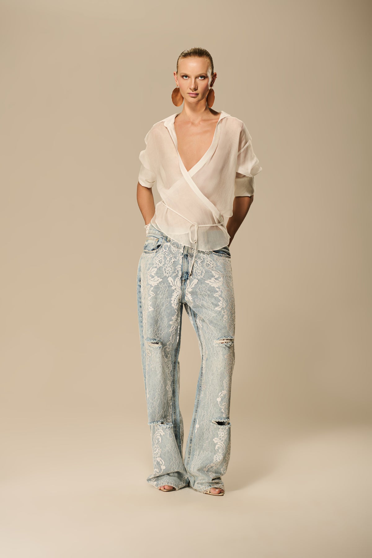 O clássico jeans ganha sofisticação e textura nesta versão com aplicação de renda floral. A modelagem relaxed e os rasgos estratégicos trazem atitude urbana, enquanto o overlay delicado em renda branca adiciona um contraste inesperado e feminino. Ideal para composições que misturam força e leveza, a peça transita entre o casual e o elegante com naturalidade. Um statement visual para quem busca autenticidade e estilo em cada detalhe.
