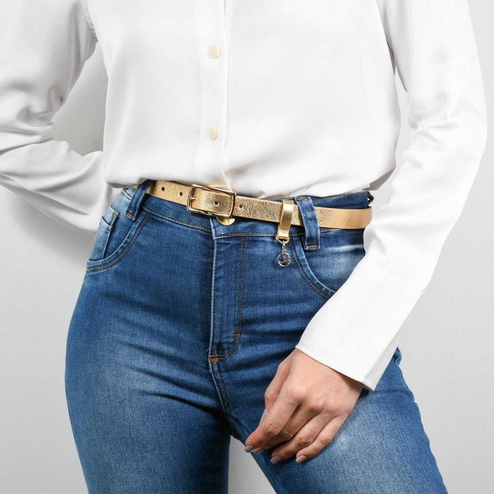 Cinto quadril em couro com fivela retangular e pingente JB dourados.