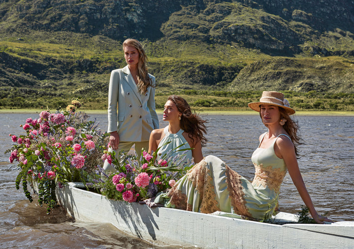 Conjunto blazer botõs e calça, na cor verde. Blazer alongado, ombros estruturados,, mangas longas e detalhe de botões frontal. Calça alfaiataria, cós alto, bolsos laterais, fechamento em zíper. Não acompanha outras peças.