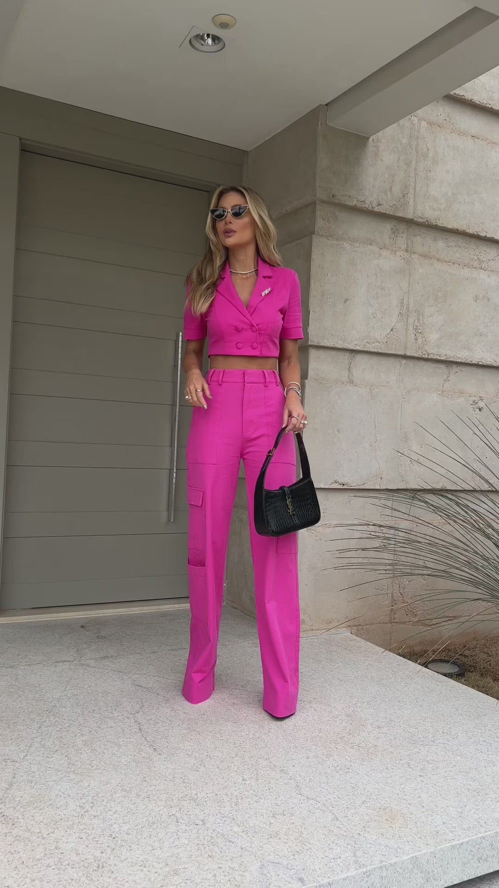 O poder do rosa em um conjunto cheio de estilo! 💖✨ Com calça cargo e cropped de sarja ele é perfeito para quem ama uma trend.