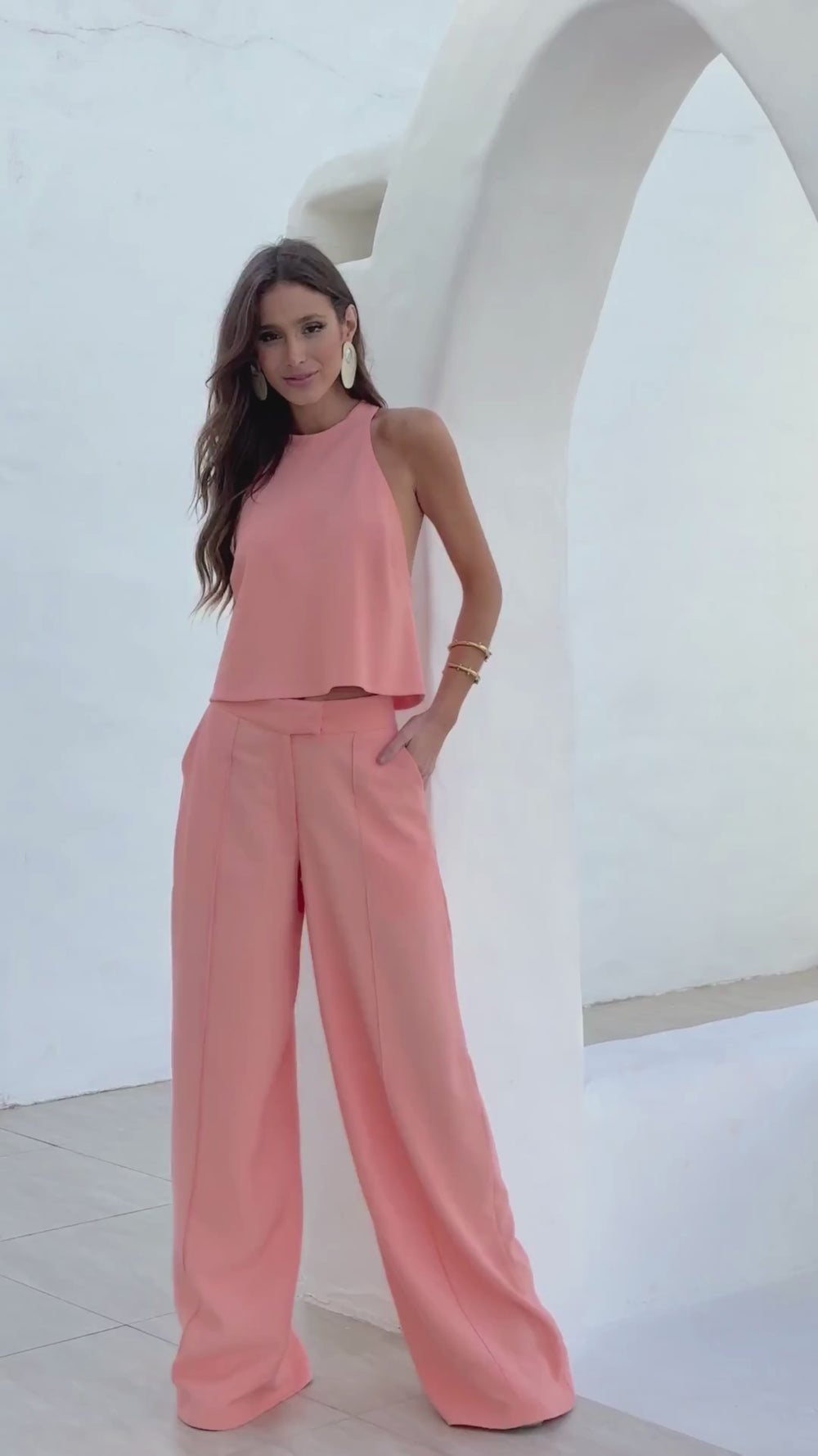 Conjunto top e calça, na cor laranja, Anne Fernandes. Blusa regata, cava alongada, fechamento em botões traseiro.Calça reta, friso frontal, bolsos laterais, fechamento em zíper.