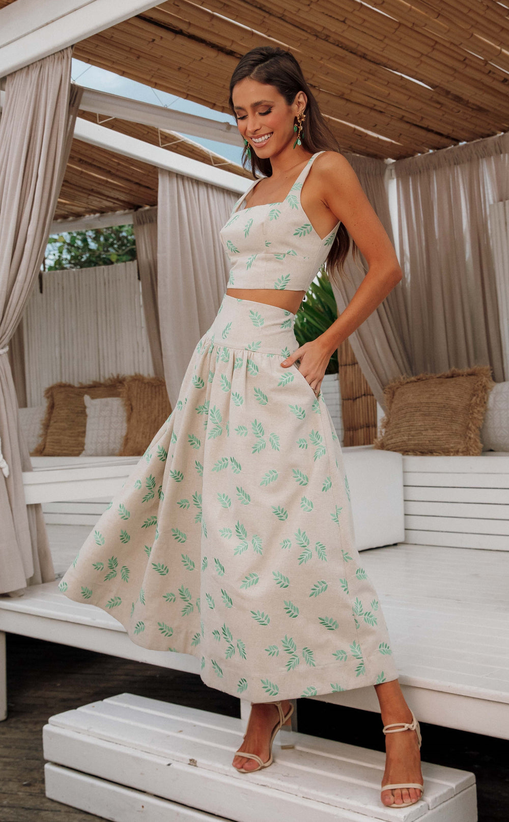 Conjunto cropped alça e saia pala, estampado. Cropped possui alças finas, decote quadrado, busto ajustado, fechamento em zíper. Saia midi, pala, bolsos laterais, fechamento em zíper.