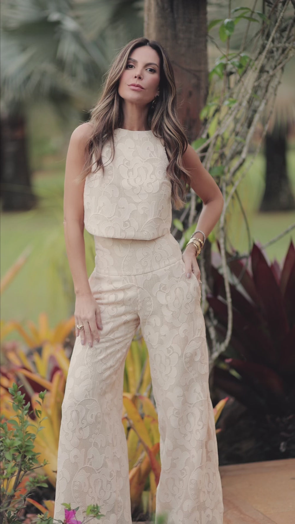 Conjunto cropped e calça renda, na cor bege. Cropped, gola U, sem manga, fechamento em zíper.Calça cós alto com pala, pantalona, bolsos laterais.