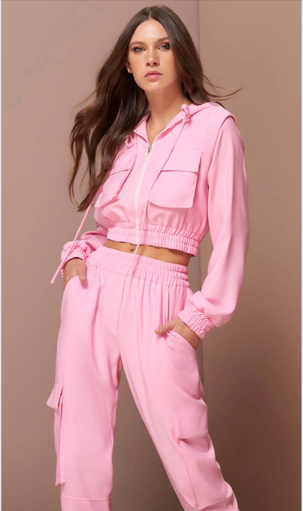 Conjunto jaqueta e calça elástico, na cor rosa. Casaco curto com elástico na barra e punho, bolsos frontais, capuz, cordãod e ajuste no capuz. Calça skinny, elástico no cós e barra, modelagem cargo com bolsos laterais.