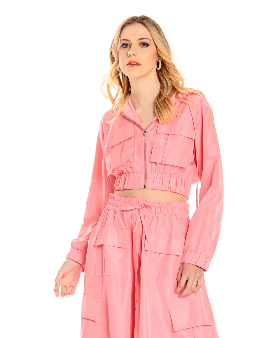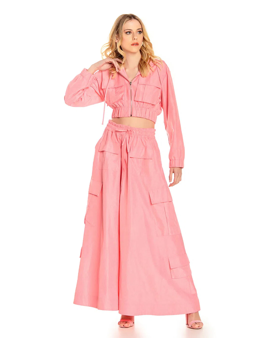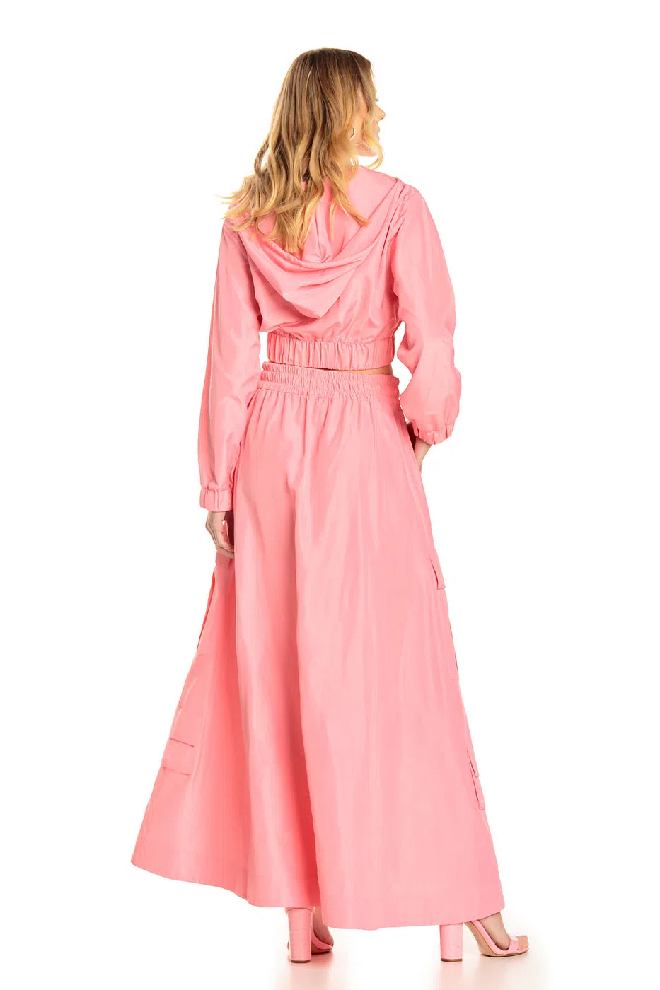 Conjunto Jaqueta e Saia Longa, na cor rosa. Jaqueta cropped com capuz, barra ajustada em elástico, fechamwnto em zíper, bolsos frontais e mangas longas. Saia longa cargo, cós de elástico, bolsos frontais e laterais. Não acompanha outras peças.