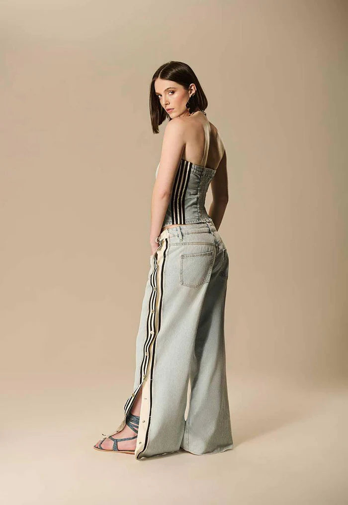 O Corselet Jeans com Tiras Pretas Laterais é a peça perfeita para quem busca um visual ousado com toque esportivo. Com design estruturado e recortes estratégicos, o modelo valoriza a silhueta com sofisticação e atitude. O elástico nas costas garante ajuste confortável, enquanto os detalhes de tiras pretas nas laterais conferem um charme urbano e contemporâneo.