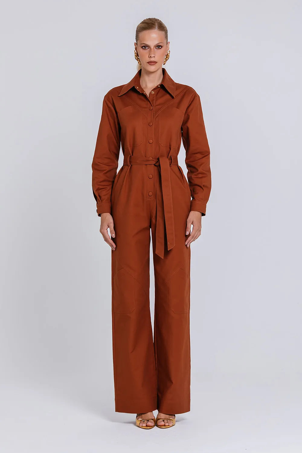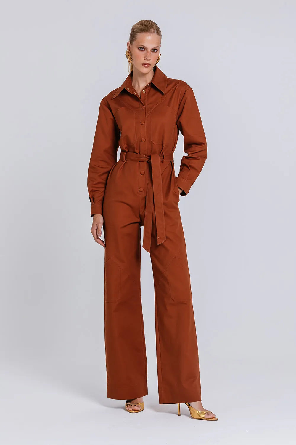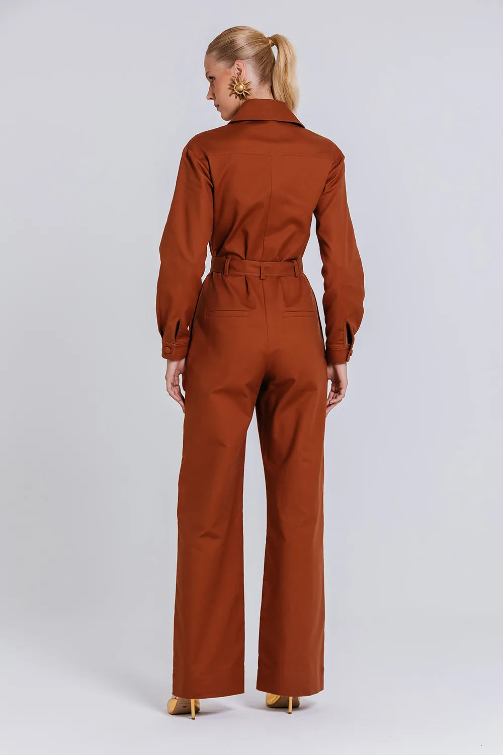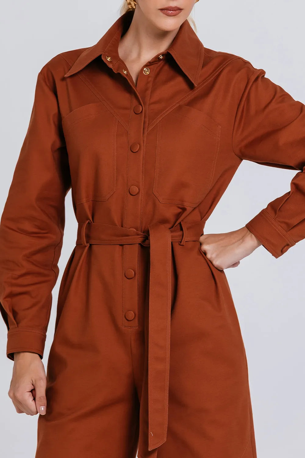 Confeccionada em compact sarja, algodão de toque macio, estruturado e caimento reto. O Macacão Carla apresenta modelagem estruturada levemente solta ao corpo. A parte superior conta com bolsos sobrepostos assimétricos, gola alfaiataria e mangas longas com pregas nos punhos, criando um visual retrô refinado. A peça possui passantes na cintura e acompanha faixa para amarração do mesmo tecido, permitindo ajuste. Fechamento frontal é feito por botões encapados, proporcionando um acabamento impecável.