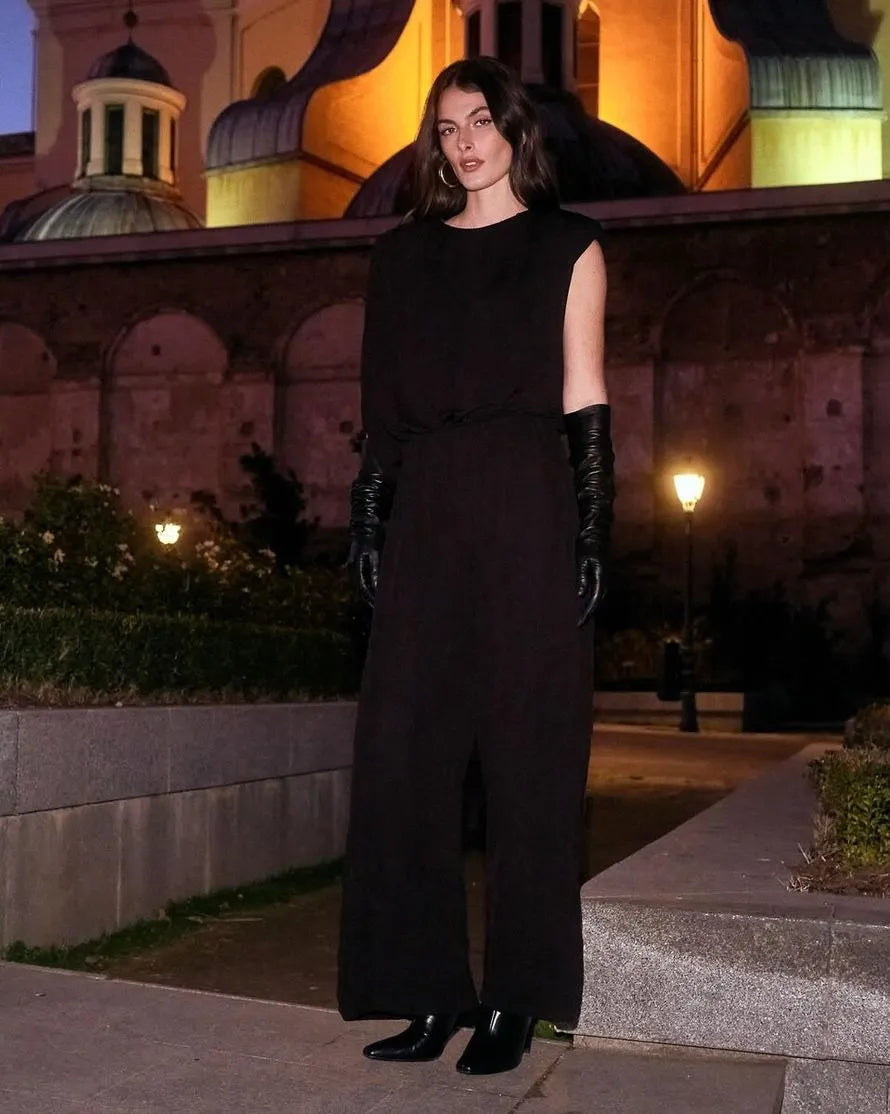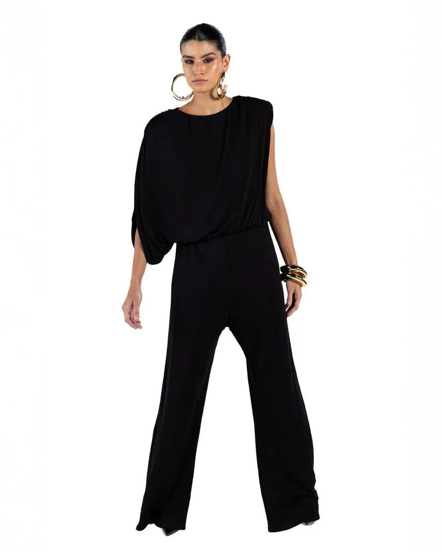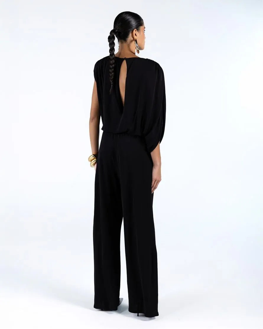 Macacão Preto Drapeado Assimétrico. Confeccionado em jersey de ryon, macacão possui ombreiras, modelo assimétrico com uma manga 3/4 drapeado, gola U,recorte na parte posterior da peça com fechamento em botão, elástico na cintura, modelo de calça reta. Não acompanha outras peças.