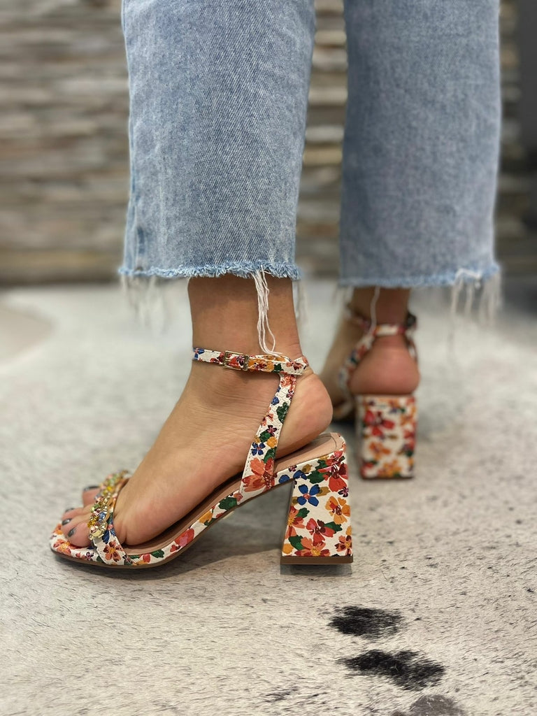 Sandália em couro com a estampa Blooming (floral) e tira frontal com composição de pedrarias multicoloridas que garante mais destaque ao sapato.