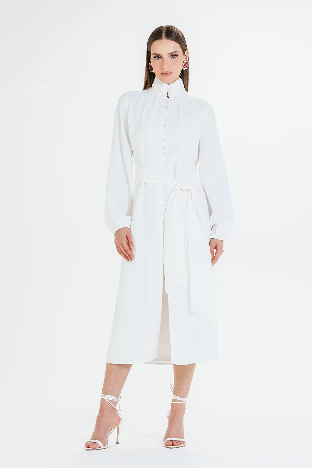 Leveza e sofisticação resumem esse vestido! Com comprimento midi, abotoamento encapado e gola alta, nosso VESTIDO ANNA exala elegância. Possui tecido em crepe que traz leveza e as mangas possuem elásticos no punho que agregam conforto.
