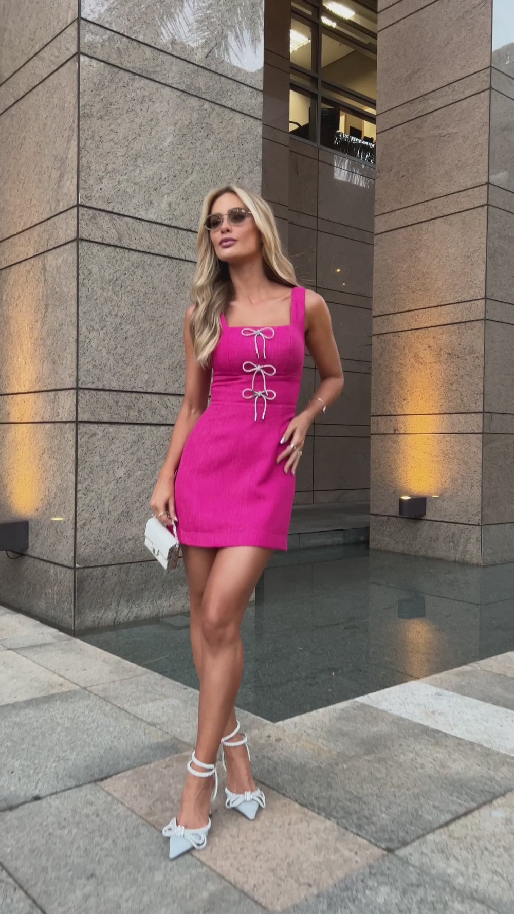 Vestido com comprimento curto feito em Tweed. Tem decote quadrado e modelagem com pences para ajuste perfeito. O zíper é de metal nas costas e acompanha broches de laços metalizados removíveis.