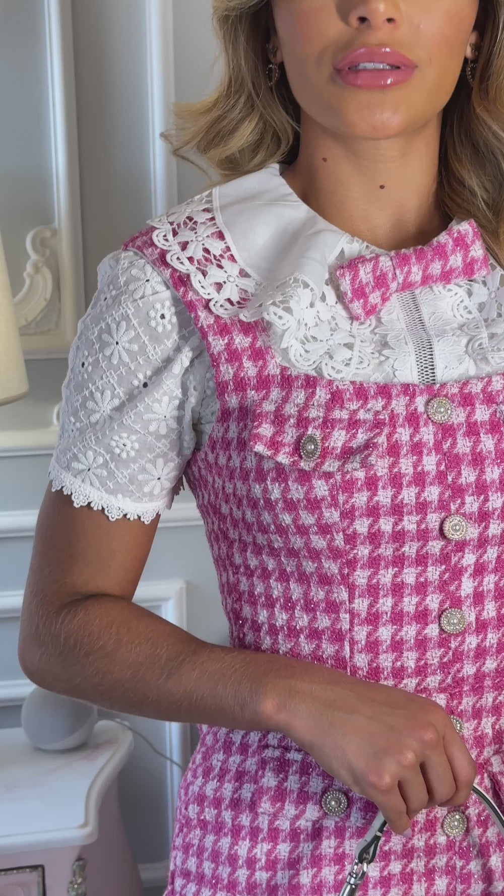 Uma combinação que não tem erro! 💖👌 Vestido curto em tweed pink combinado com a camisa cropped de laise de algodão branco, que tem detalhes em guipir e golinha babador. 😍💐