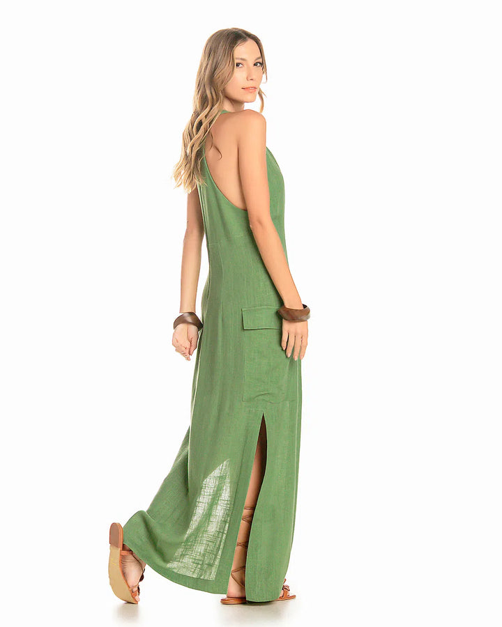Vestido longo com bolso lateral, na cor verde. Vestido longo, possui bolsos laterais, gola U, e fenda lateral e costas nadador, fechamento em zíper.