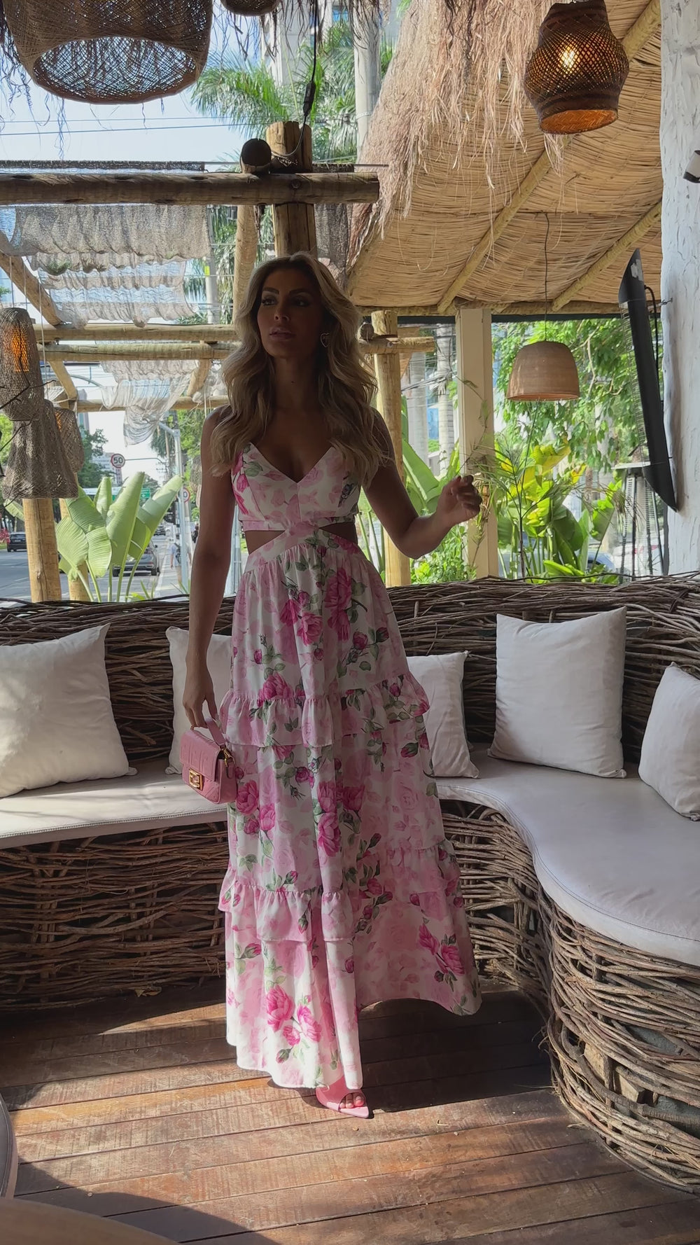 Vestido longo de crepe floral. Tem babados em camadas e decote "v" com alças finas. Possuí bojo e recorte cut-out na lateral e costa. O zíper é de metal.