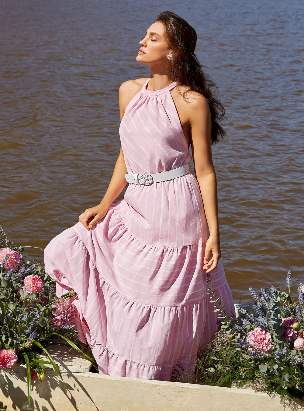 Vestido longo listras. Vestido longo, modelagem acinturada, decote nas costas com amarração, não acompanha outras peças.