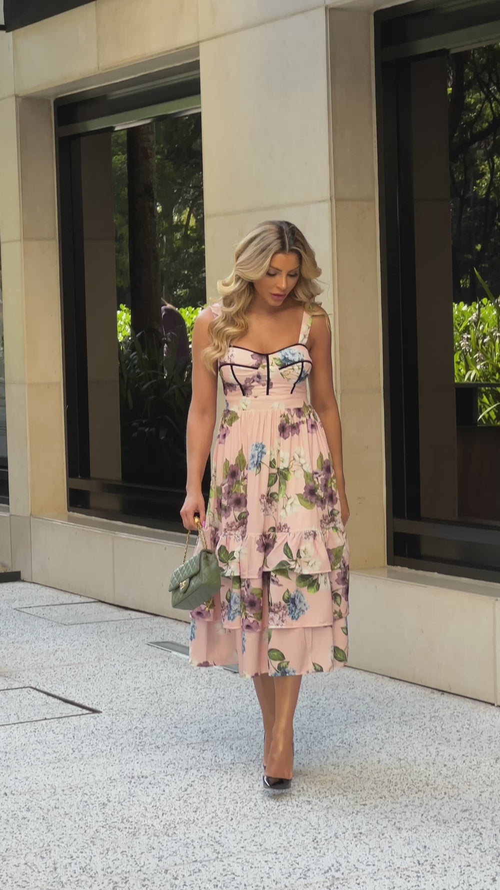 Vestido midi de chiffon com estampa floral/nude. A modelagem é clássica com alças largas e saia ampla com babados franzidos. O bojo é meia taça com detalhes em viés preto. O zíper é de metal na costa.