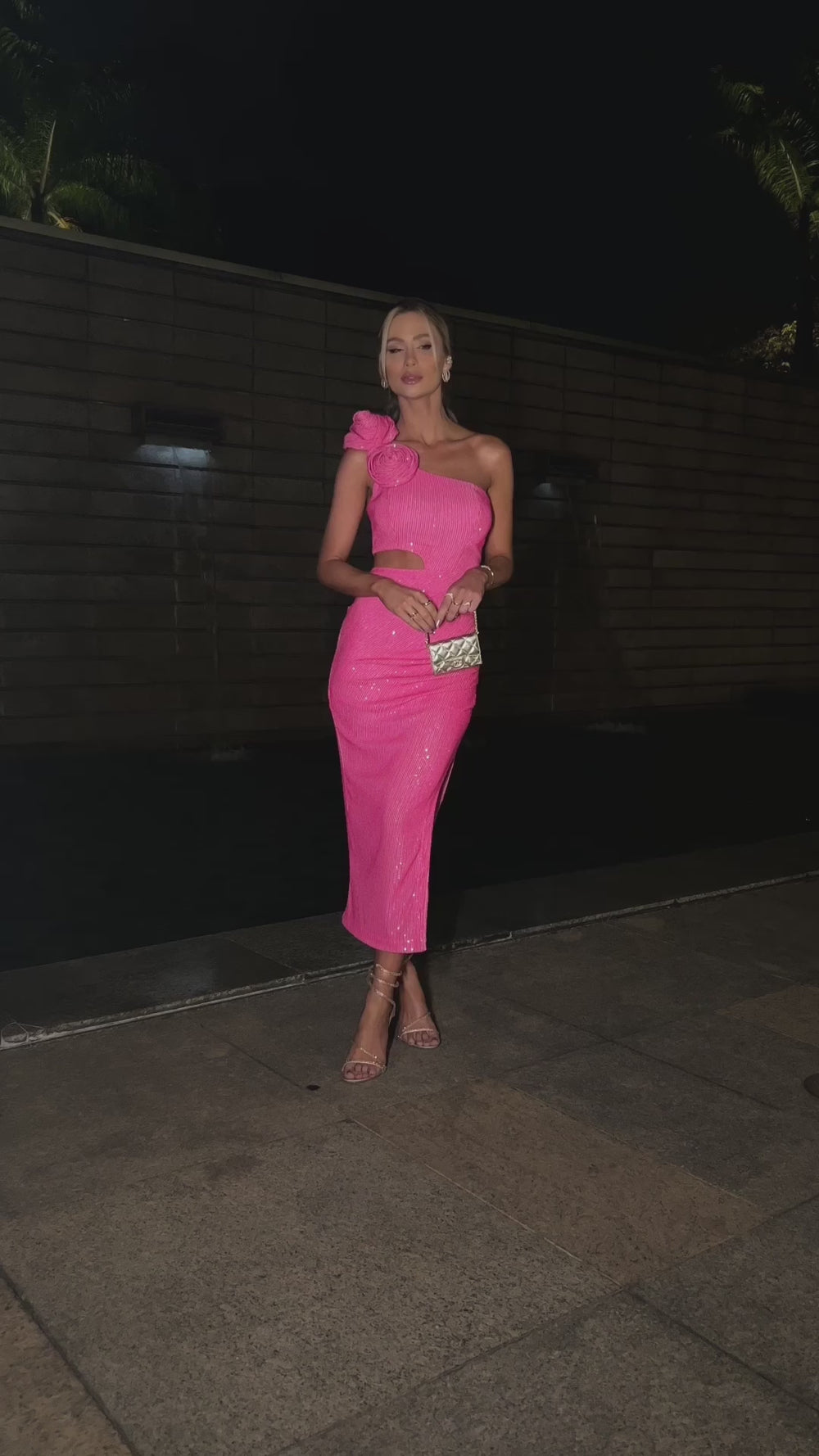 Todo glamour do paetê cor-de-rosa + modelagem exclusiva e aplicação de maxi flores feitas à mão.