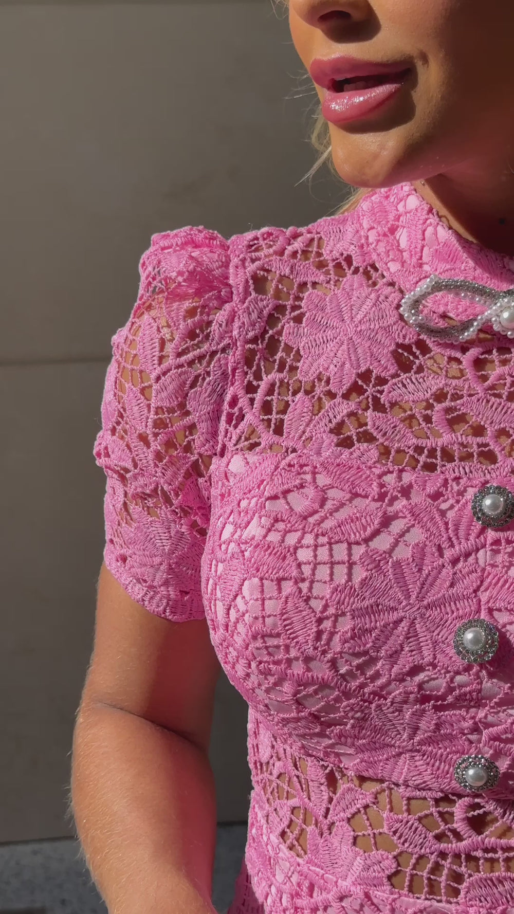 Vestido midi de guipir rosa com recortes evasê. Tem mangas e barrado personalizado. A gola é alta e o decote tem botões decorativos prata com broche de lacinho. O top é vazado com forro no bojo. O zíper é de metal na costa.