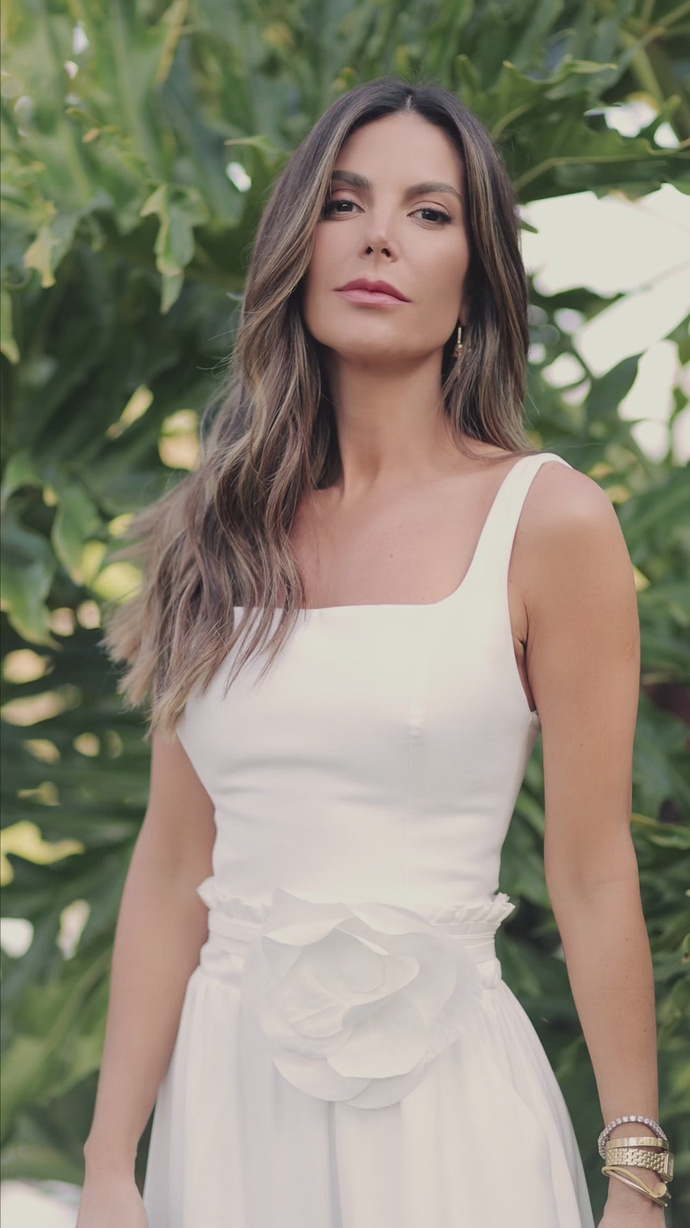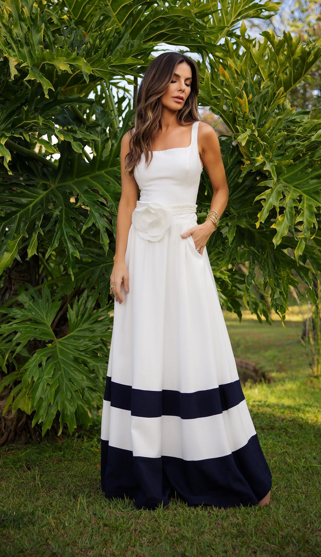 Vestido barra bicolor com flor. Vestido longo, decote quadrado, alças, detalhe no cós com babado, com listras na barra na cor marinho, fechamento em zíper.