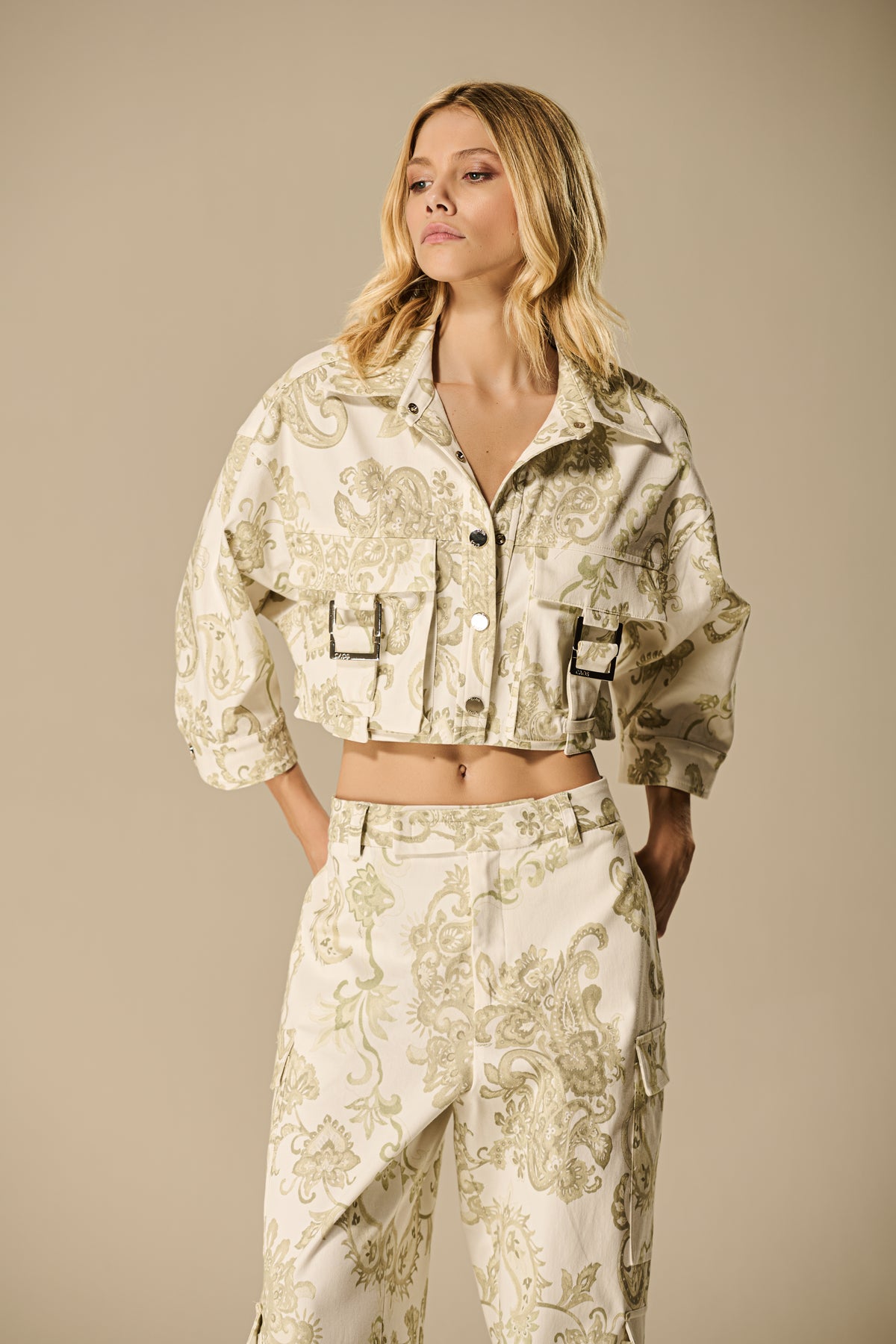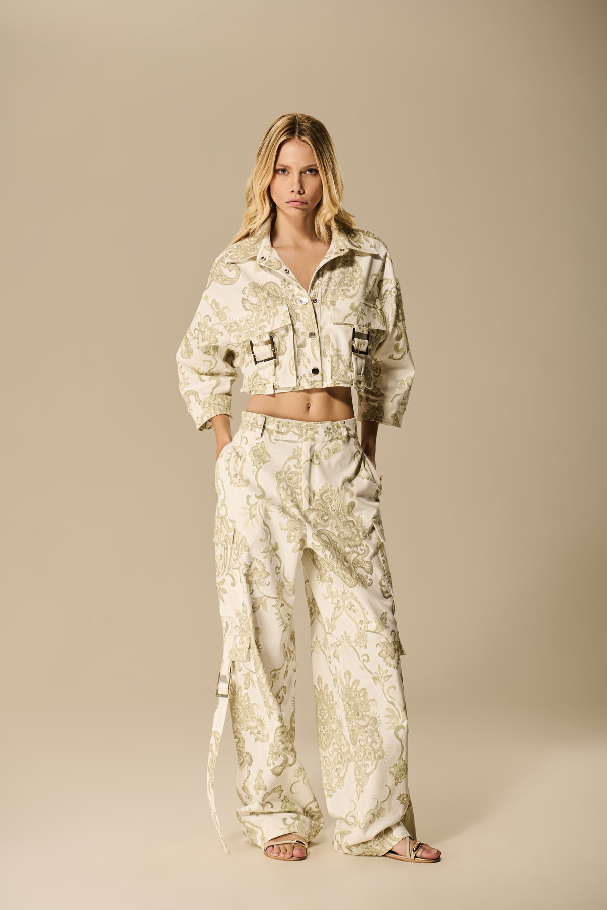 A tradicional calça cargo ganha sofisticação nesta versão com estampa paisley em tons suaves. Com modelagem ampla e cintura alta, a peça combina funcionalidade e design, destacando bolsos utilitários e tiras com fivelas que adicionam personalidade à silhueta. O padrão paisley traz um toque artístico e refinado, criando contraste entre o urbano e o delicado. Ideal para composições contemporâneas que valorizam conforto, estilo e originalidade.