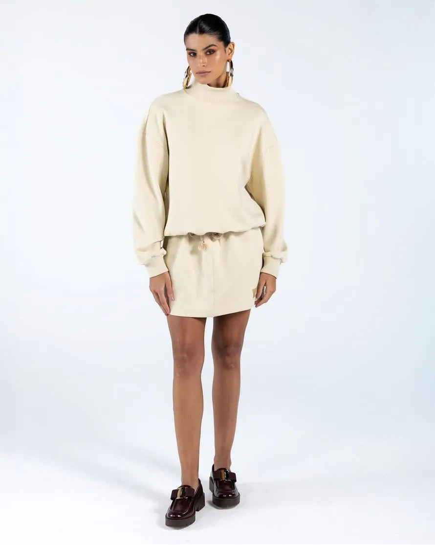 Conjunto Bege de Malha Casaco e Saia. Casaco moletom possui gola alta, mangas longas, modelagem ampla com dealhes de tricot na gola, punho e barra. Saia curta,cós reto com detalhe de amarração para ajuste de cintura, bolsos laterais e posteriores,detalhe de etiqueta na parte frontal do lado esquerdo.