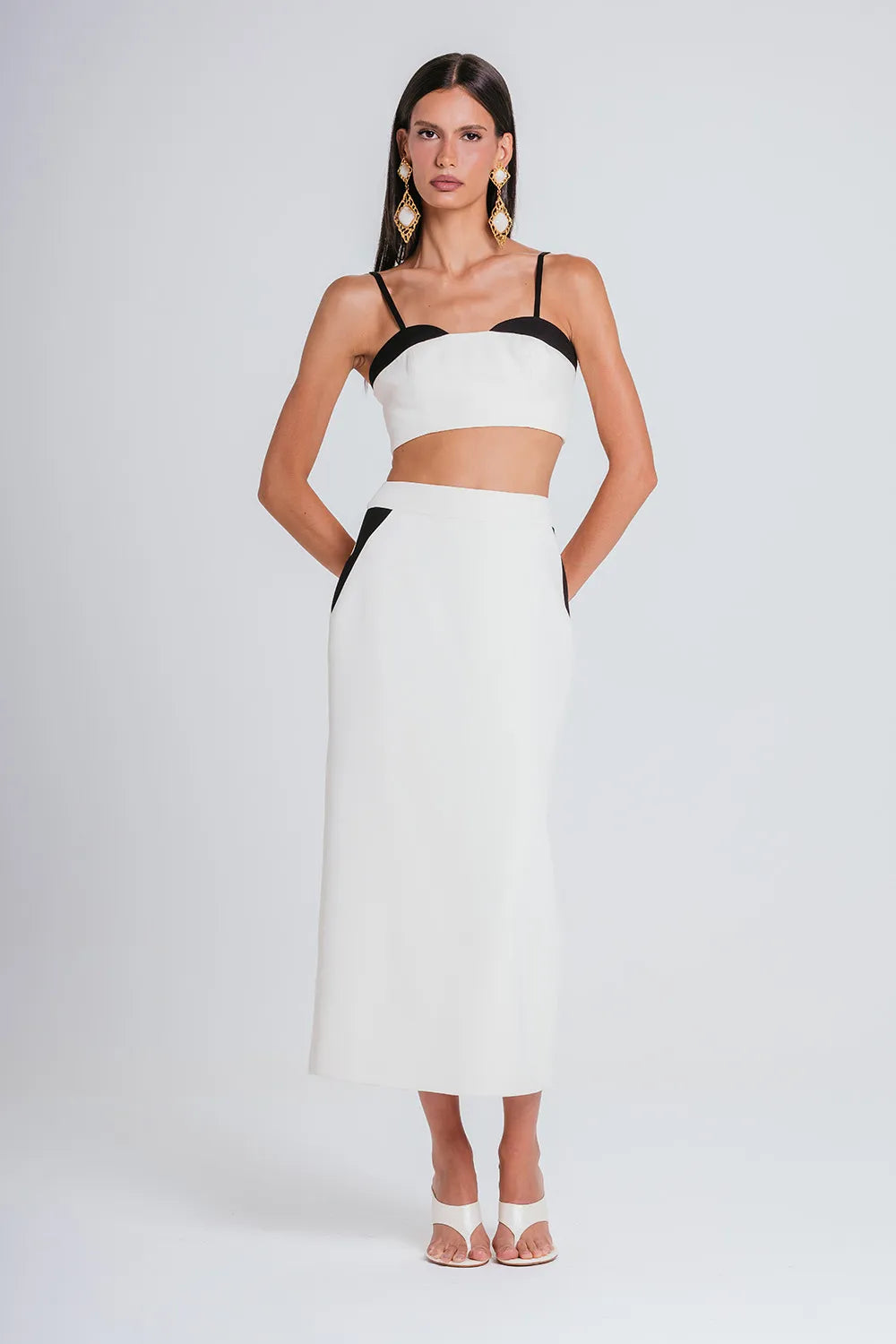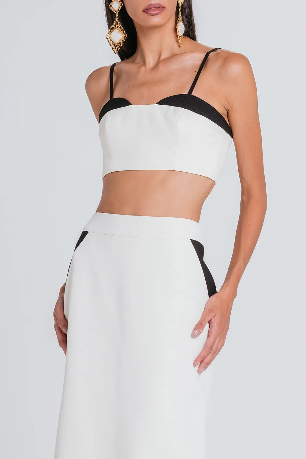 Sua modelagem lápis traz a elegância tradicional, enquanto sua cor bicolor entrega informação de moda e eleva sua produção para algo especial e único. Possui fechamento por zíper invisível meio costas e fenda traseira que traz liberdade de movimento e conforto sem preocupações.
