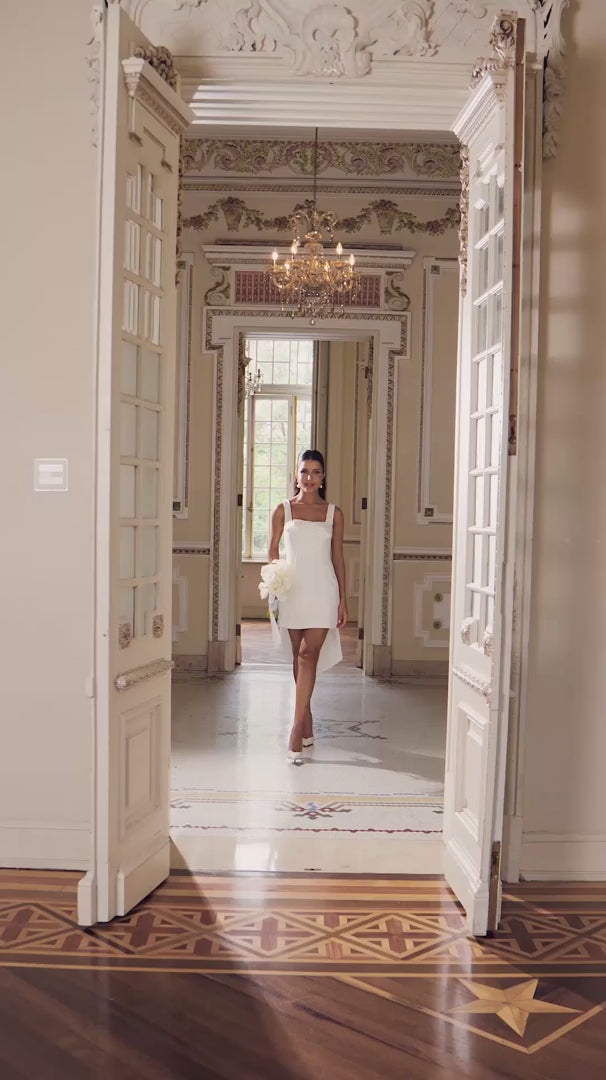 Vestido curto em crepe off white com modelagem acinturada e saia estruturada. O busto apresenta decote reto com detalhe de laço aplicado, trazendo um toque delicado e sofisticado ao visual. O destaque da peça está na saia com sobreposição que se alonga na parte de trás, criando movimento e elegância. Nas costas, a abertura com botões decorativos e fechamento por zíper de metal valoriza ainda mais a silhueta, ideal para cerimônias civis ou celebrações especiais.