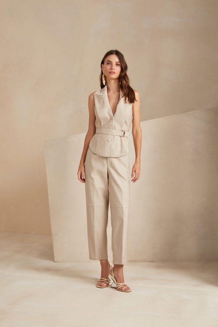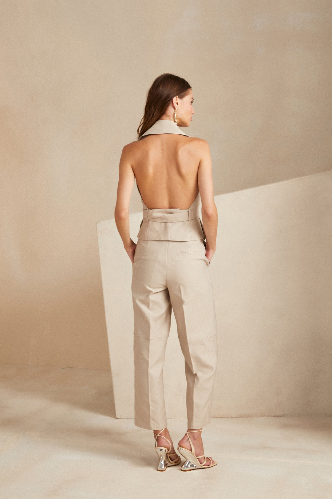 Tailored set of vest and pants. Vest in a slim fit, halter neck, with buckle fastening. Pants in a classic Skunk tailored shape.