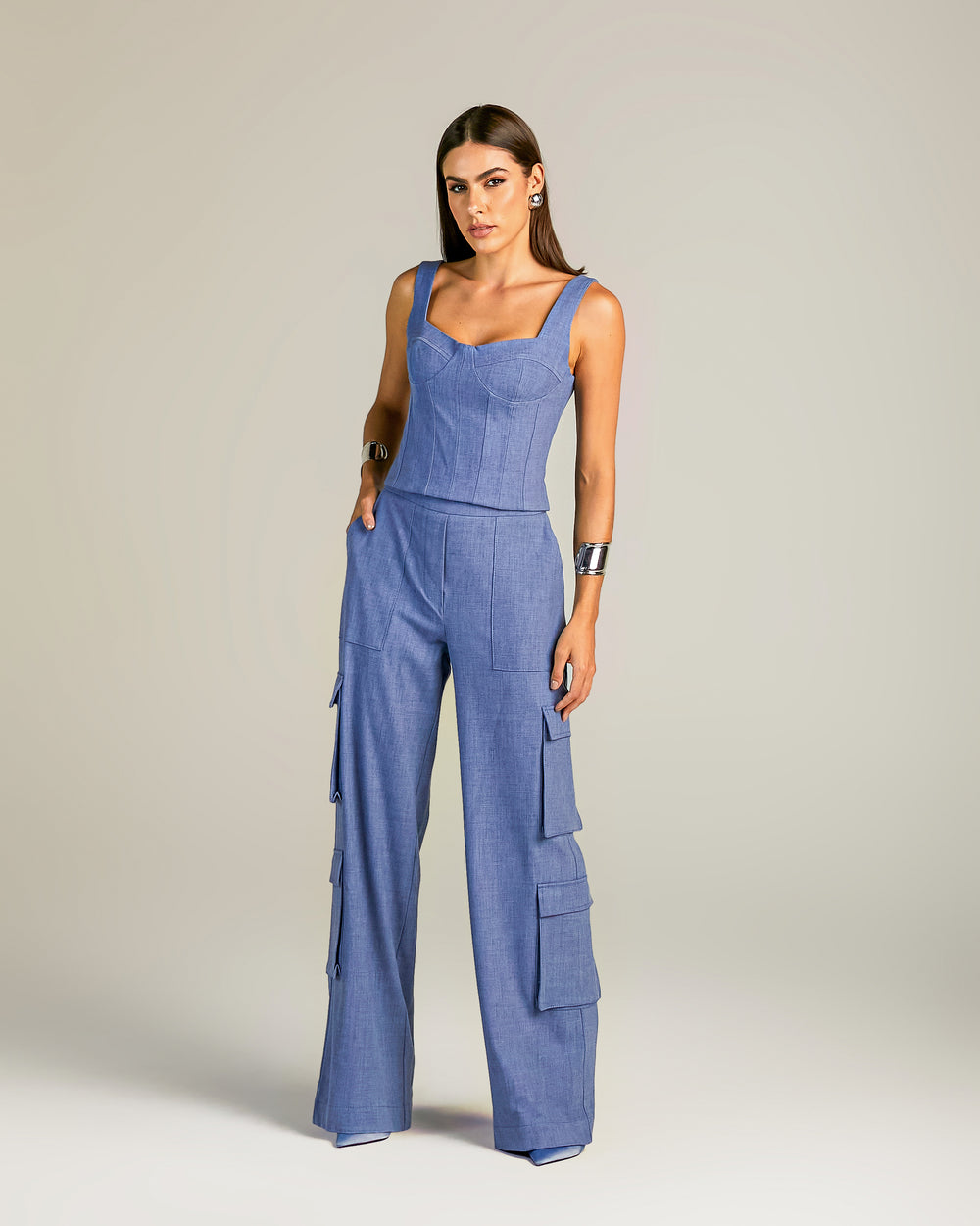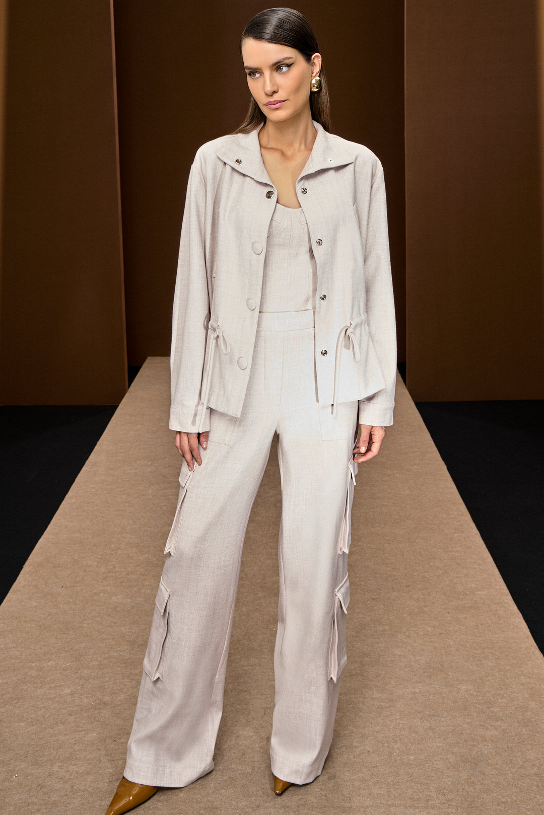 Corset Parka and Cargo Pants Set, Anne Fernandes. Elongated parka with adjustable waist, long sleeves, snap button closure. Corset has medium straps, designed bust, zipper closure. Straight cargo pants, high waist, has side pockets and 3D pockets. Lightweight tailored fabric.