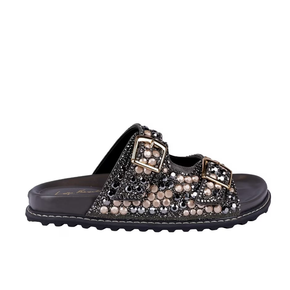 The Luiza Barcelos sandals are a winter staple! Exuberant constructions make these models a true crystal dream and make even the most classic sandals shine. The storm gray model with multi-colored crystal applications has a round toe, decorative buckles, an anatomical insole and a flatform tractor sole.