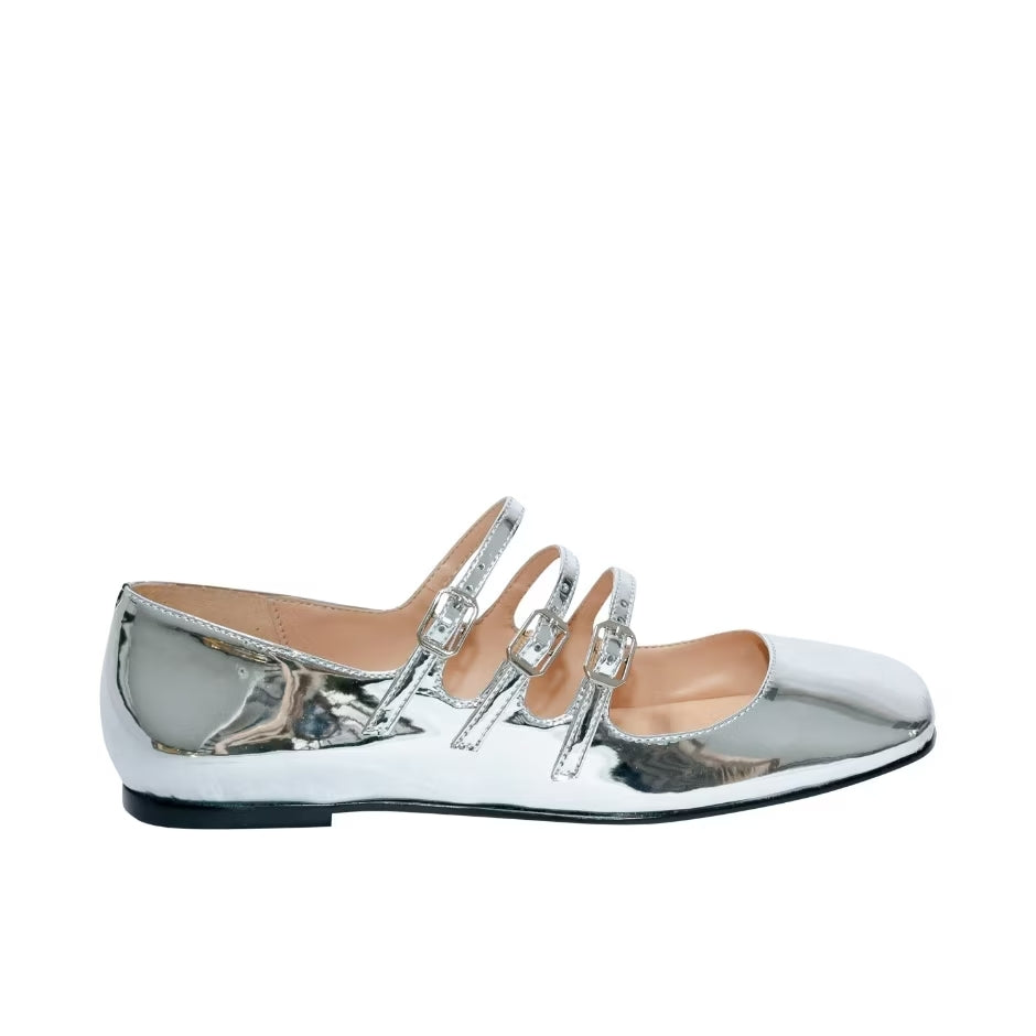 Mary Janes in Specchio transform delicacy into a spectacle of shine and style. Elegant and charming, they reflect sophistication in every step. The model is made of technological material in silver tones, has a square toe, parallel straps on the arch and polished buckles that add extra shine.