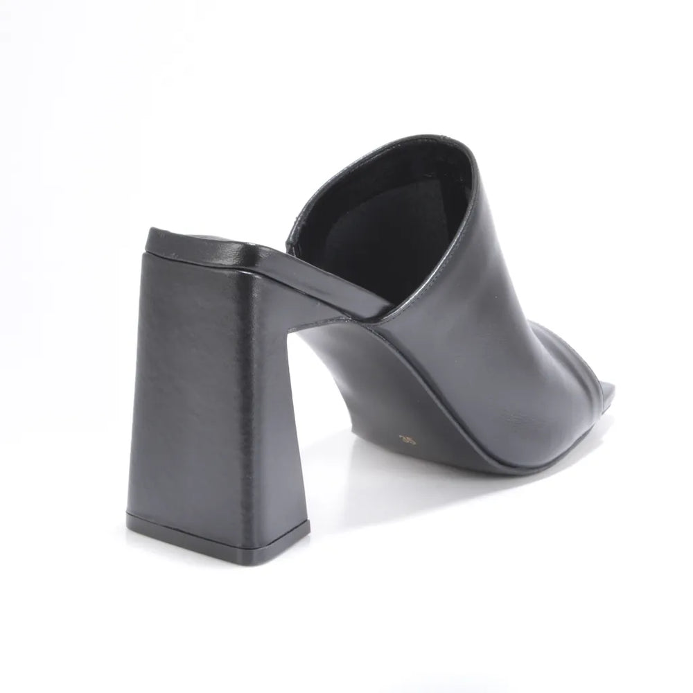Black leather clogs. The high, flared block heel provides elegance and comfort to the look.