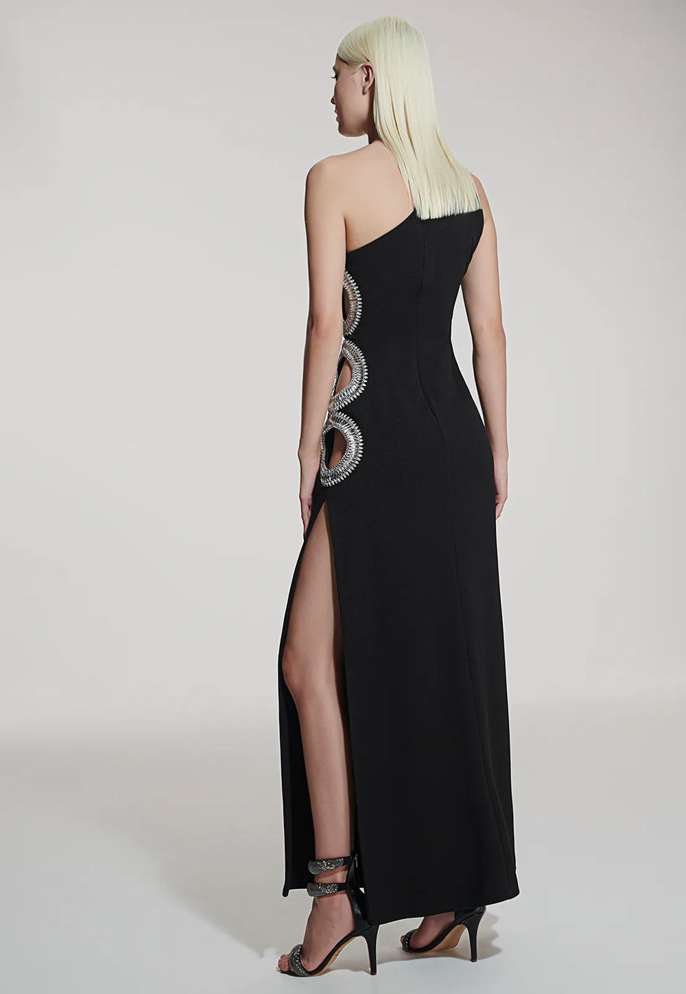This maxi dress is a stunning and stylish piece to add to your winter wardrobe. With a straight cut and side slit, it features a circular cut-out on the side with beaded and rhinestone applications, offering a glamorous and sophisticated look. The one-shoulder detail adds a touch of elegance and modernity to the piece, while the long length brings a sense of luxury and sophistication. Wear it to special events or formal occasions, pairing it with delicate accessories and high heels for a stunning look. This dress is a perfect choice to stand out during the winter season.