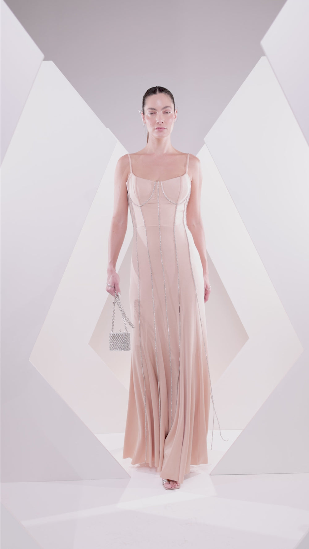 rhinestone strips and vertical lines, creating a stunning look. Its elegant drape and highlighted movement