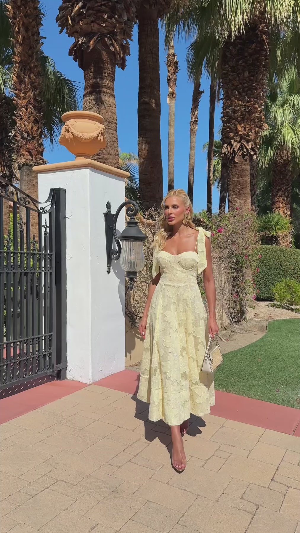 The Yellow Floral Glow Midi Dress is made of lace with a floral design.