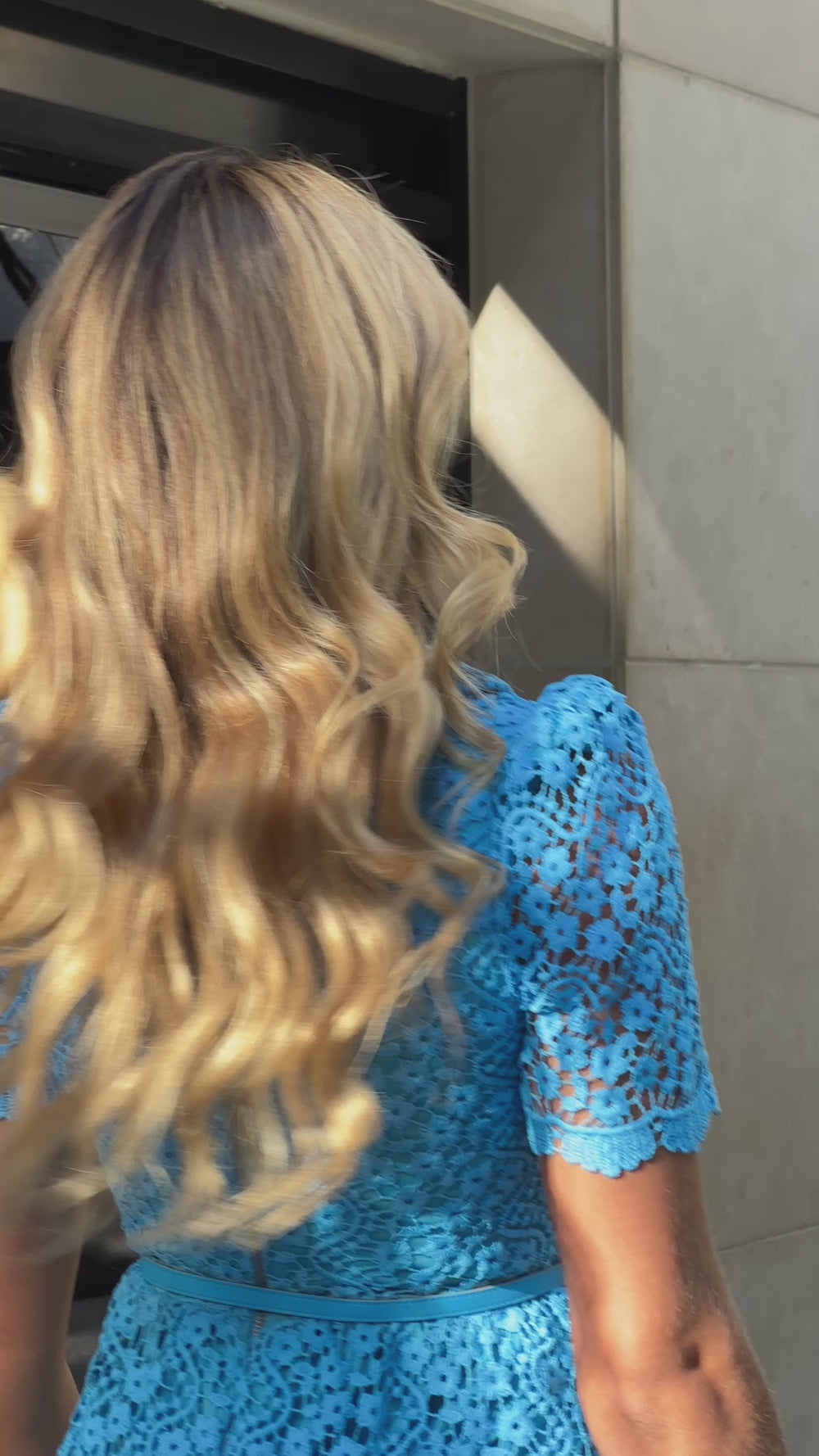 Blue guipure midi dress. It has a round neck and embroidered sleeves and hems. The buttons are decorative and covered and the top is openwork with lining at the bust. The zipper is metal at the back. It comes with an exclusive belt.