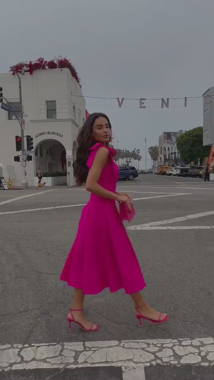 Pink laise midi dress. It has flared cutouts on the skirt, puffed sleeves, a neckline with a priest collar and English lace trim. The buttons are covered and the zipper is metal on the back.