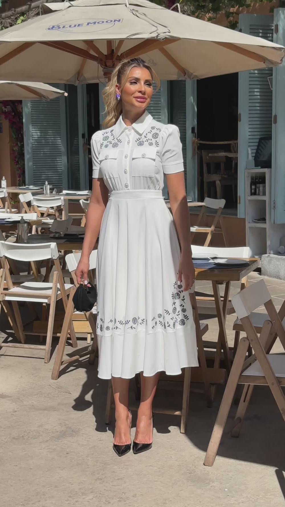 White crepe midi dress. It has a classic design with an English collar and functional pockets. The buttons are decorative and the zipper is metal on the back. The embroidery is in navy blue on the hem and yokes.