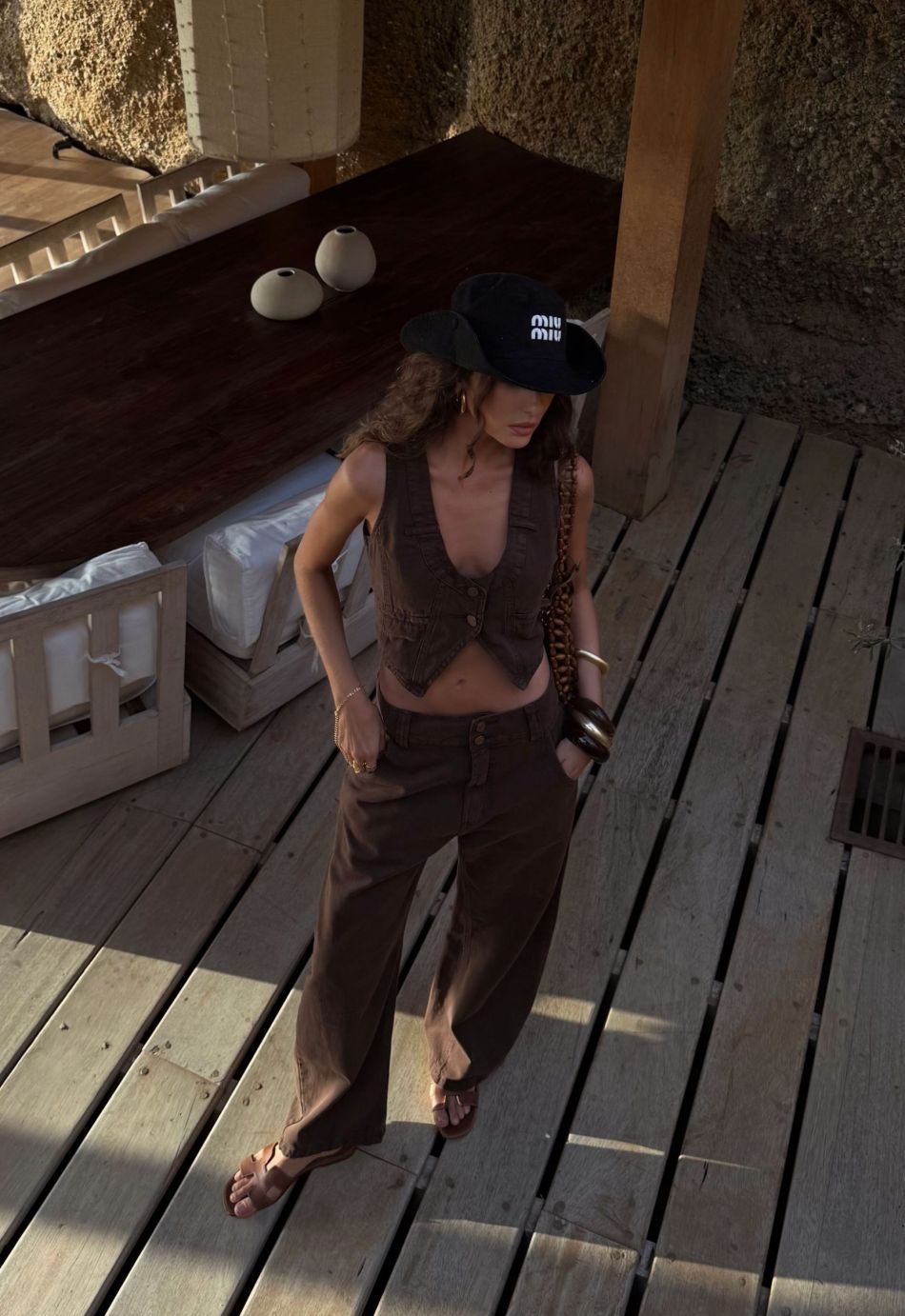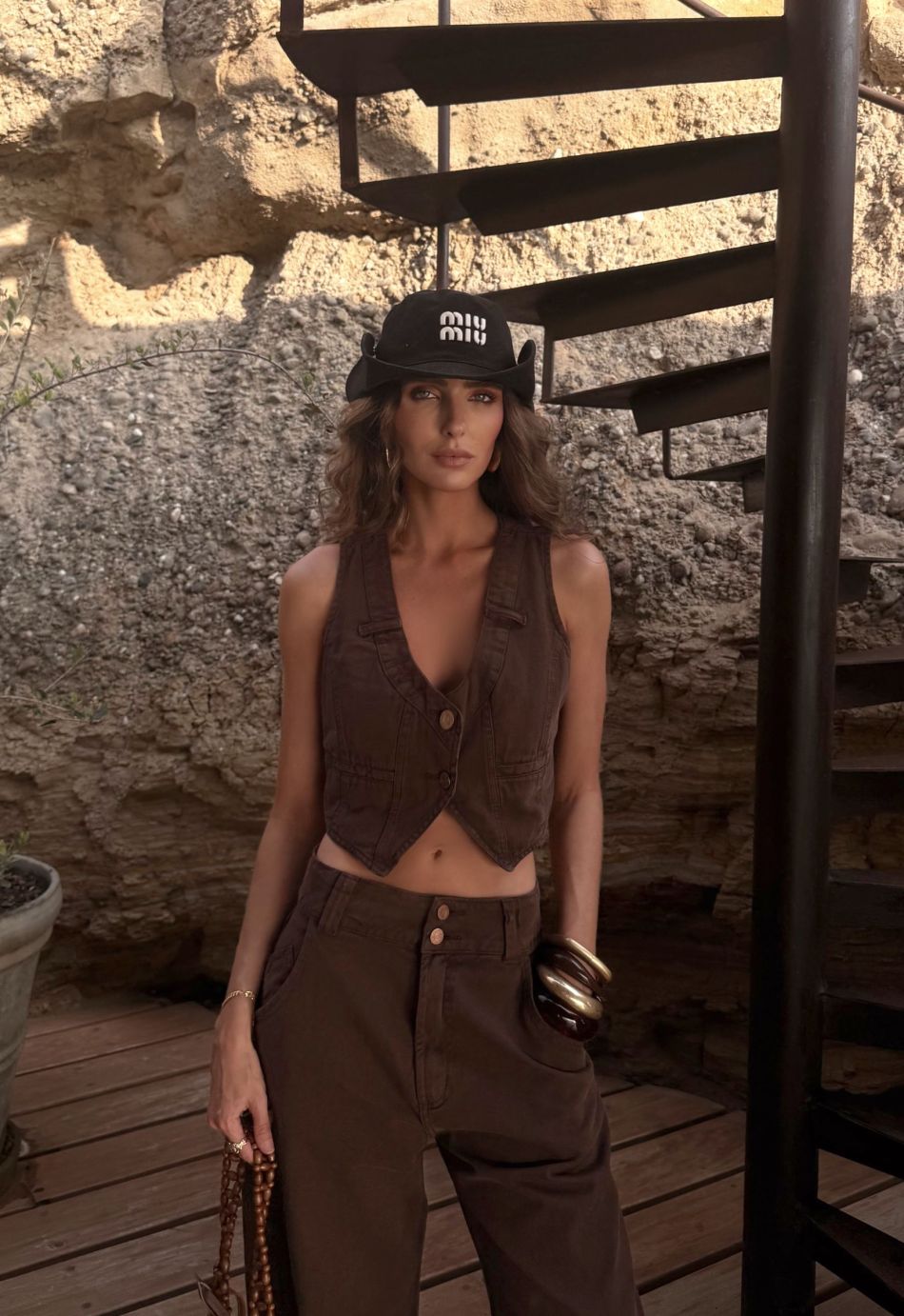 The Mandolin vest is a structured piece; its sleeveless design emphasizes the shoulders and décolletage, while the fitted, slightly cropped cut ensures a feminine and contemporary look. The light denim wash adds lightness and versatility, serving as a wardrobe staple—ideal for creating monochromatic ensembles or contrasting with vibrant colors.