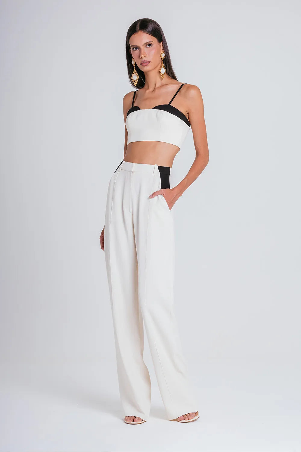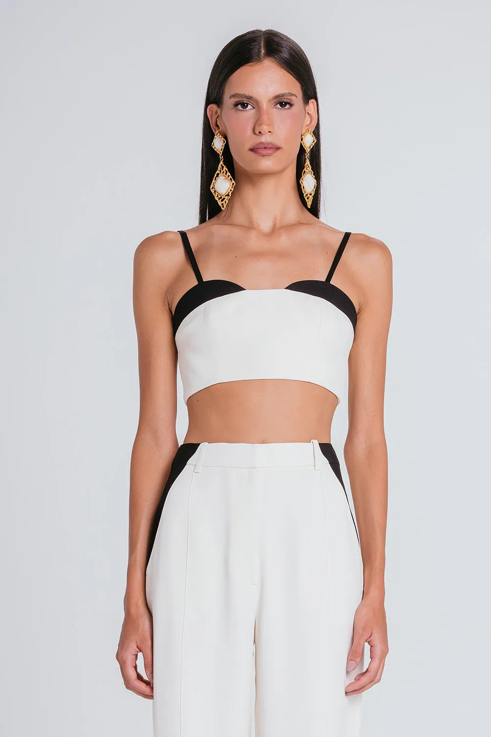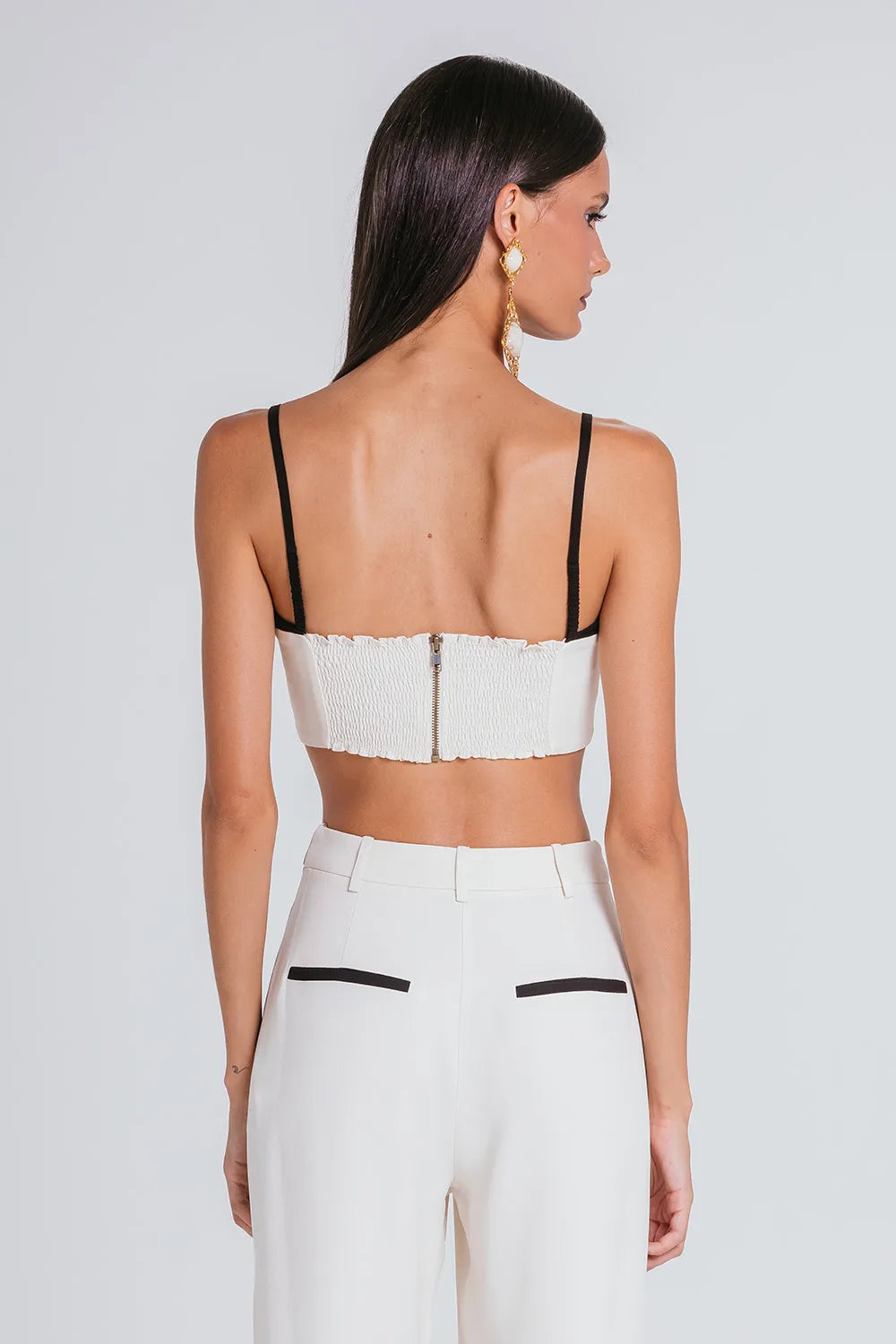 Made from our finest tailoring fabric, acetate crepe with viscose, it features a straight cut with contrasting color details on the rounded bust. It also has thin straps that provide support and comfort during wear. Back closure with invisible zipper and elastic, shaping the feminine silhouette and ensuring freedom of movement.