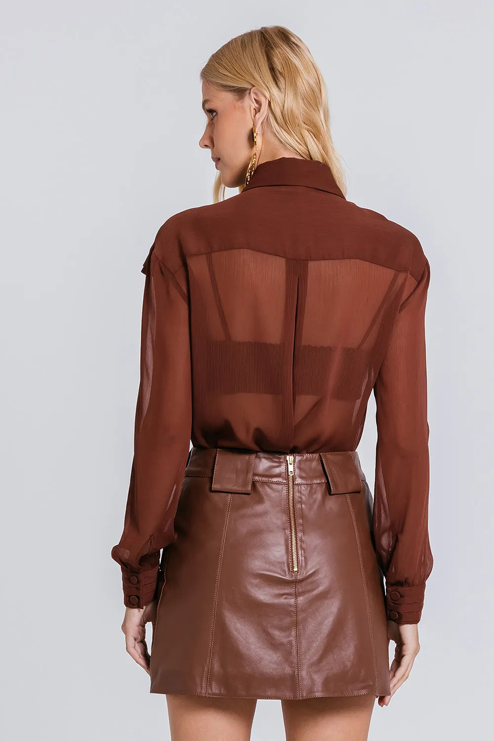 Made from sheer fabric, it offers versatility and lightness. The double-ruffled shoulder cutout adds fluidity, while the delicate collar reinforces its modern sophistication.