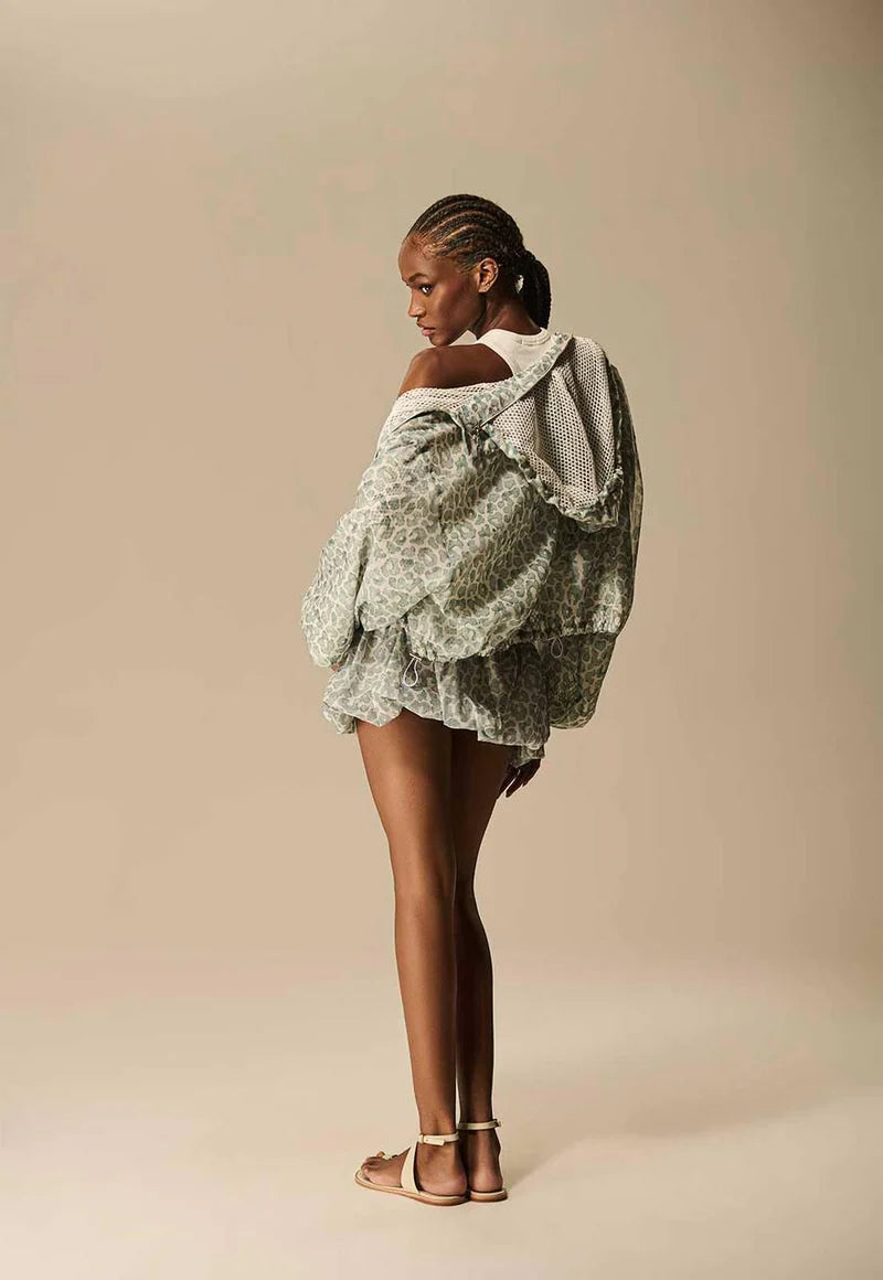 The Washed Leopard Hooded Jacket conveys an urban and sophisticated look for 2026. The animal print pattern in soft tones creates a fashionable and contemporary vibe, while the mesh-trimmed hood adds a sporty-chic touch. With elastic at the hem and cuffs, it provides comfort and a fitted fit, making it ideal for layering casual outfits with a touch of bold, contemporary style.