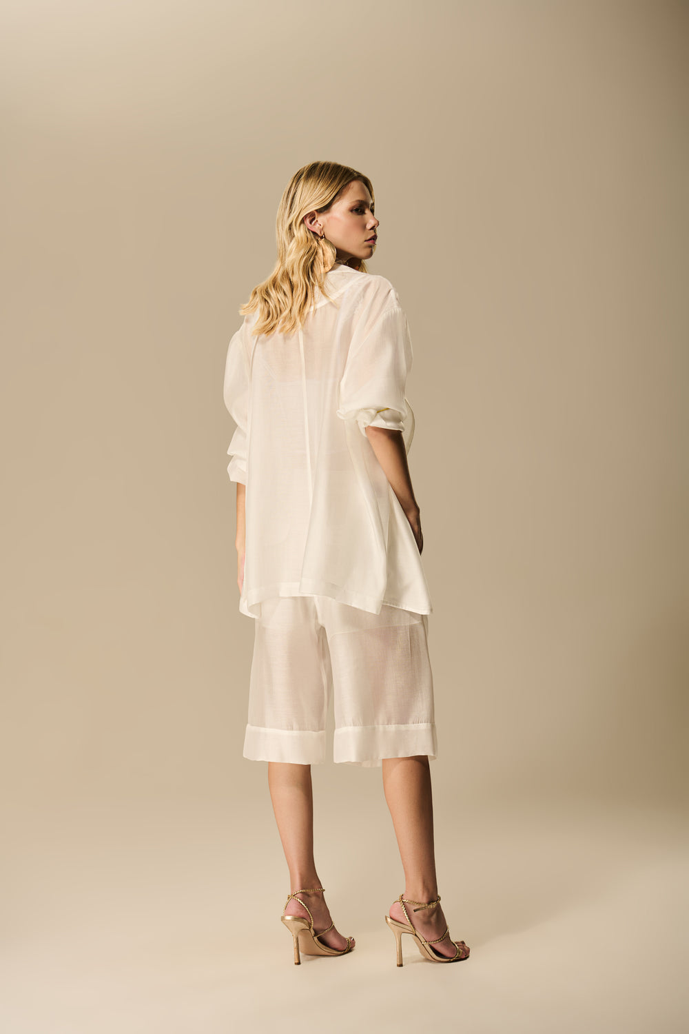 Leve como o ar e marcante como uma assinatura visual, este blazer de organza redefine o tailoring contemporâneo com uma abordagem etérea e arquitetônica. Confeccionado em organza translúcida de alta qualidade, ele equilibra estrutura e fluidez, revelando camadas sutis e criando profundidade visual. A faixa longa e versátil, presa na gola, pode ser usada solta para um efeito dramático ou amarrada para compor um styling mais editorial.
